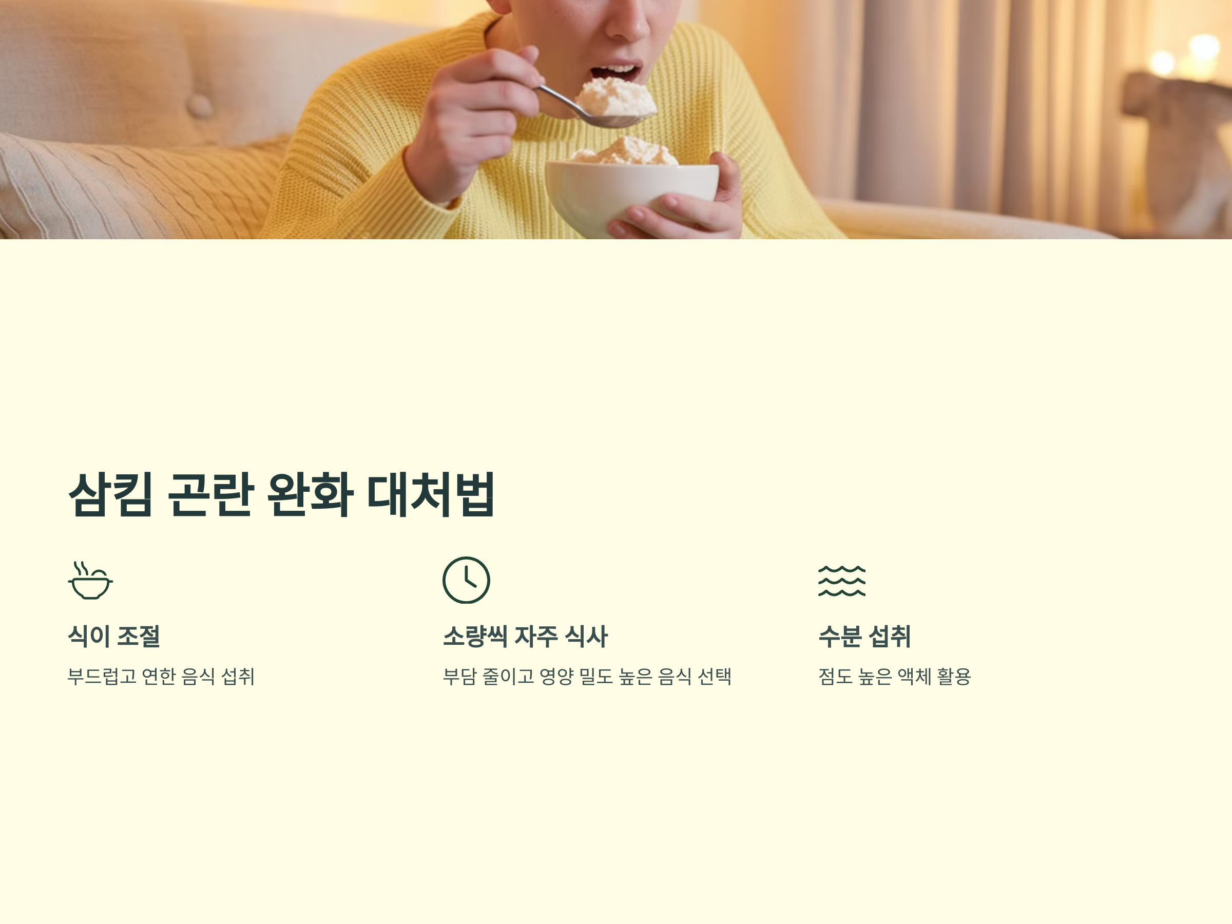 - 한 번에 많은 양을 먹기보다는 여러 번 나누어 식사하면 부담을 줄일 수 있습니다.