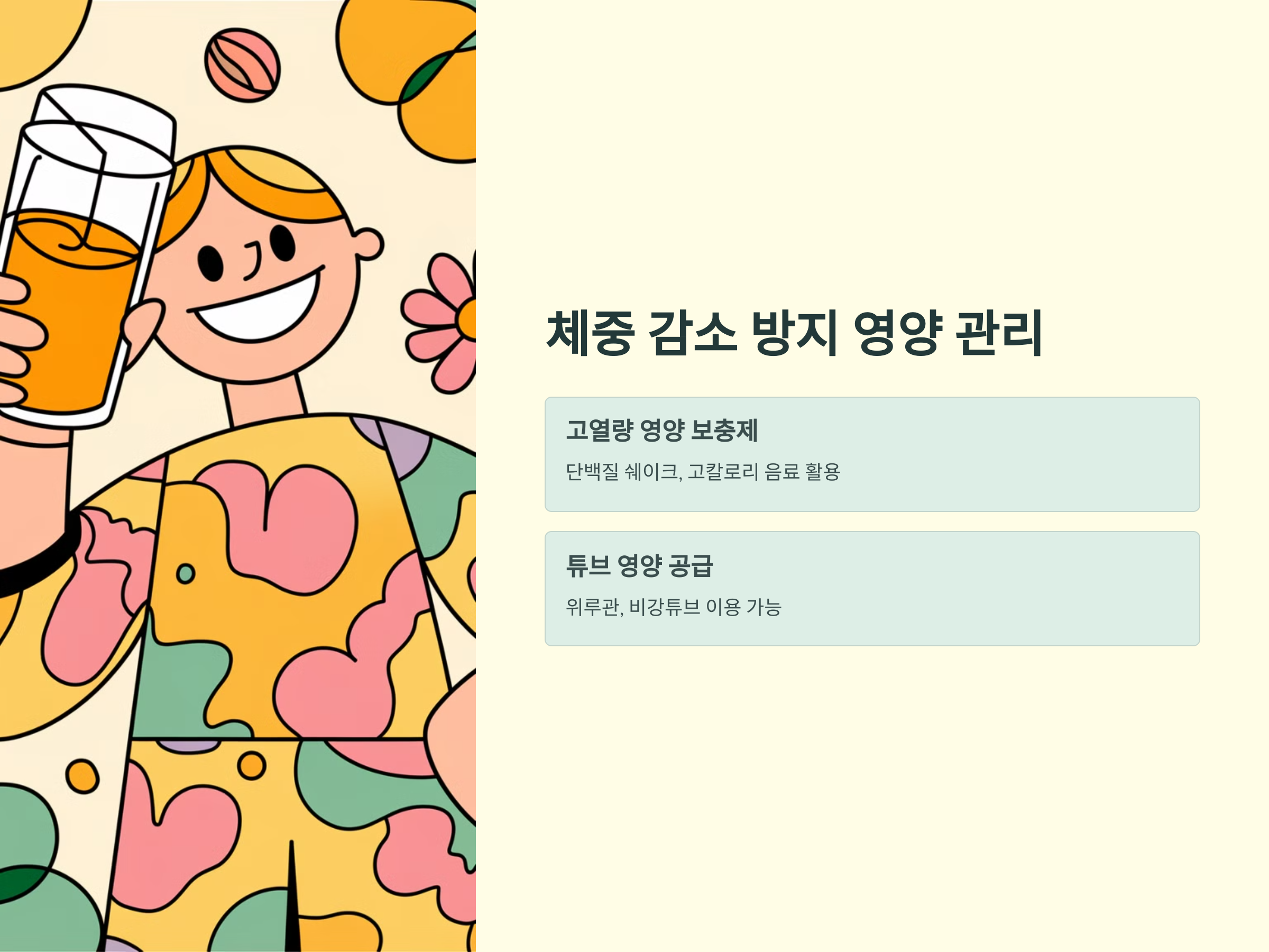 - 경구 섭취가 어려운 경우, 의료용 영양 보충제를 활용하는 것이 좋습니다.