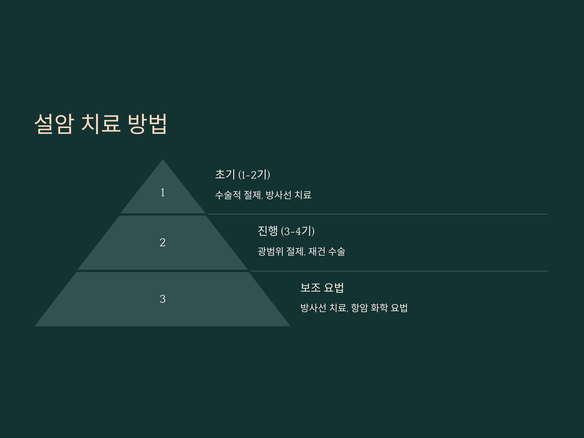 설암 치료는 병기와 전이 여부에 따라 다르며, 주로 수술, 방사선 치료, 항암 치료가 시행됩니다.