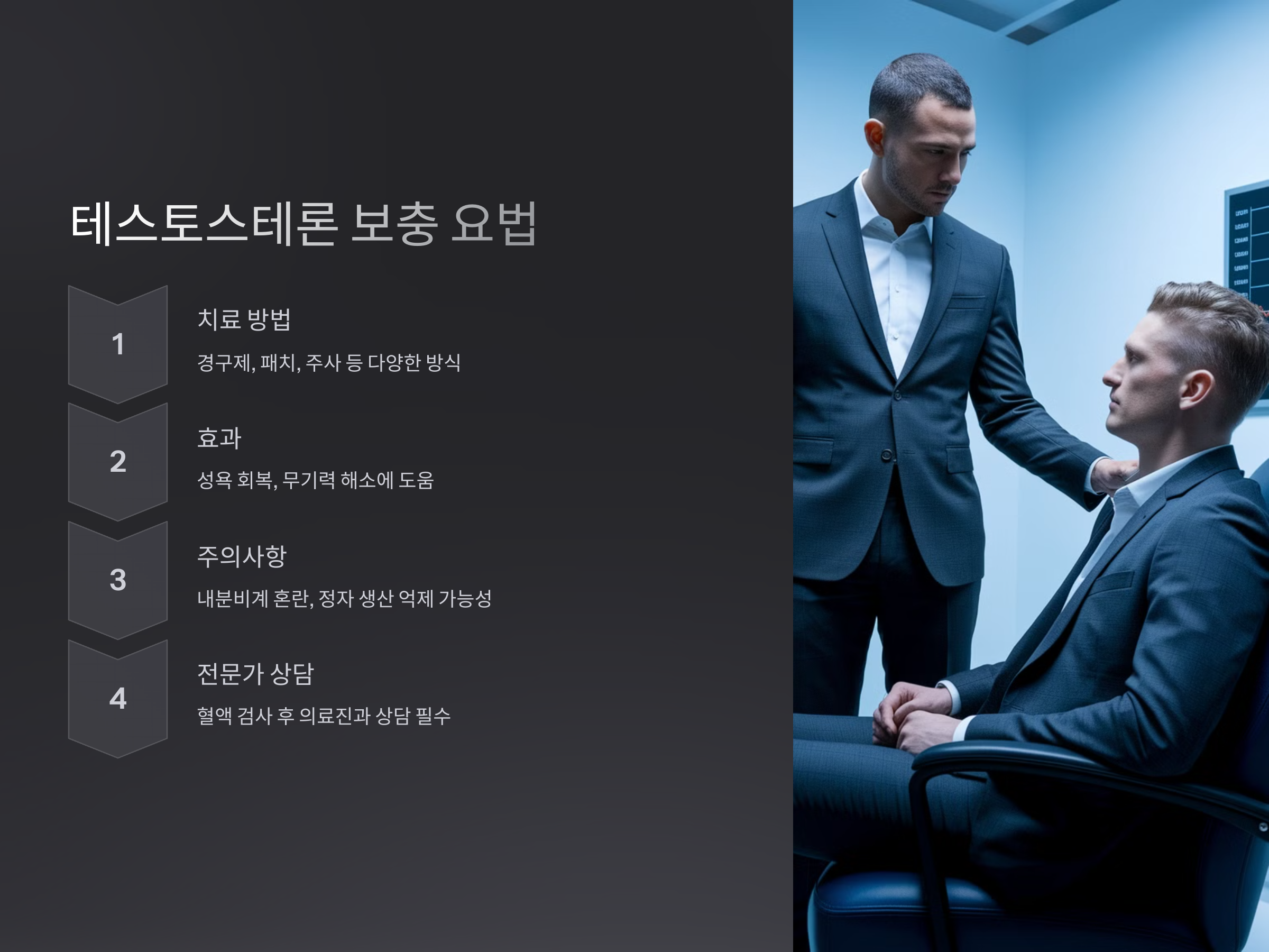 호르몬 치료는 일반적으로 중증의 고환 기능 저하 환자에게 권장되며, 단기적으로 성욕 회복 및 무기력 해소에 효과를 보일 수 있습니다. 테스토스테론 보충 요법은 경구제, 패치, 주사 등 다양한 방식으로 제공되며, 전문의의 정확한 진단과 처방이 필수적입니다.