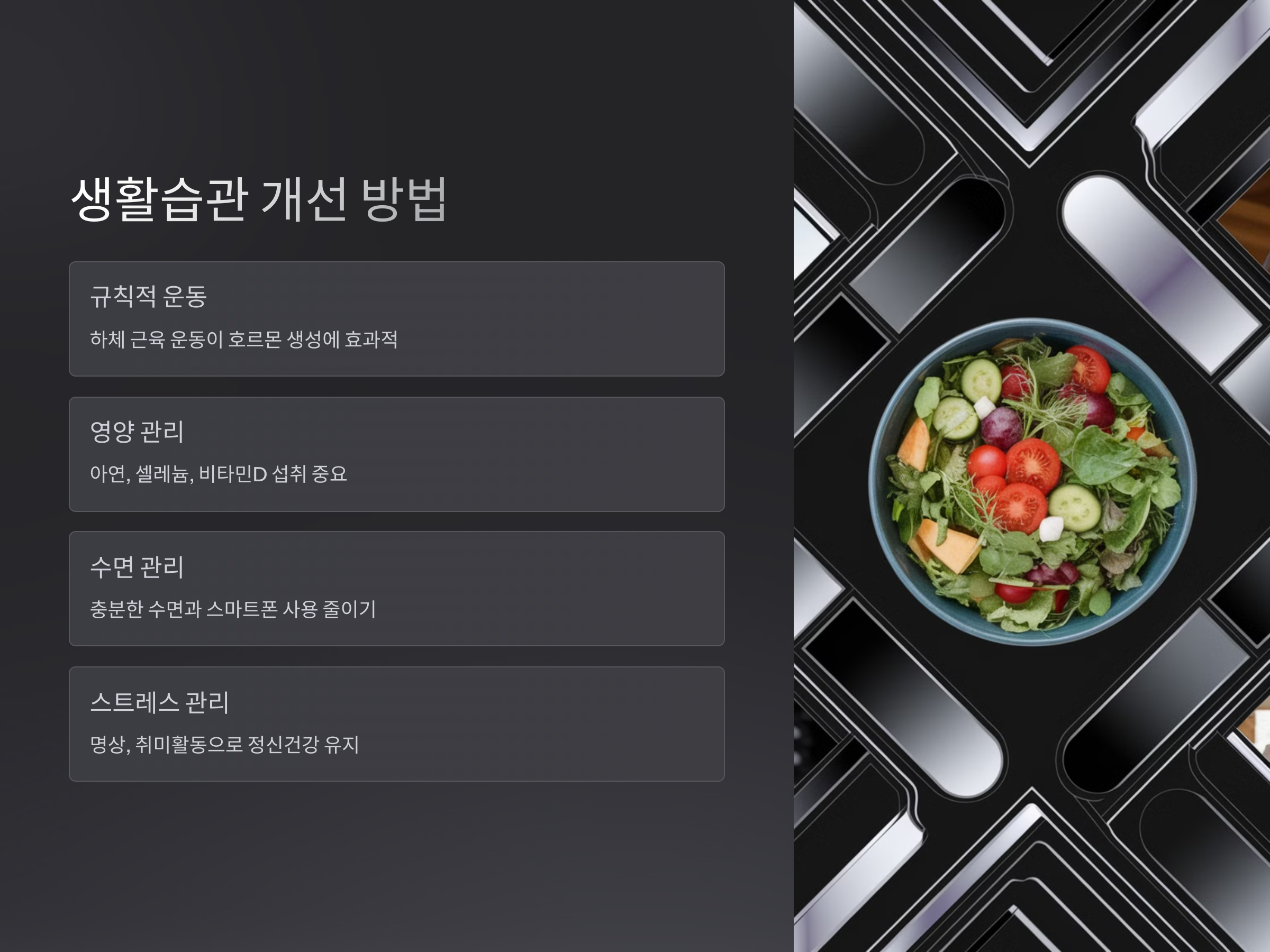 식습관도 빼놓을 수 없습니다. 아연, 셀레늄, 비타민D 등은 고환 건강을 유지하고 호르몬 균형을 잡는 데 필수적인 영양소입니다. 가공식품을 줄이고 자연식 중심의 식단으로 전환하면 에너지 수준이 자연스럽게 회복될 수 있습니다. 또한, 스마트폰 사용을 줄이고 수면 위생을 지키는 것도 무시할 수 없는 회복 요인입니다.