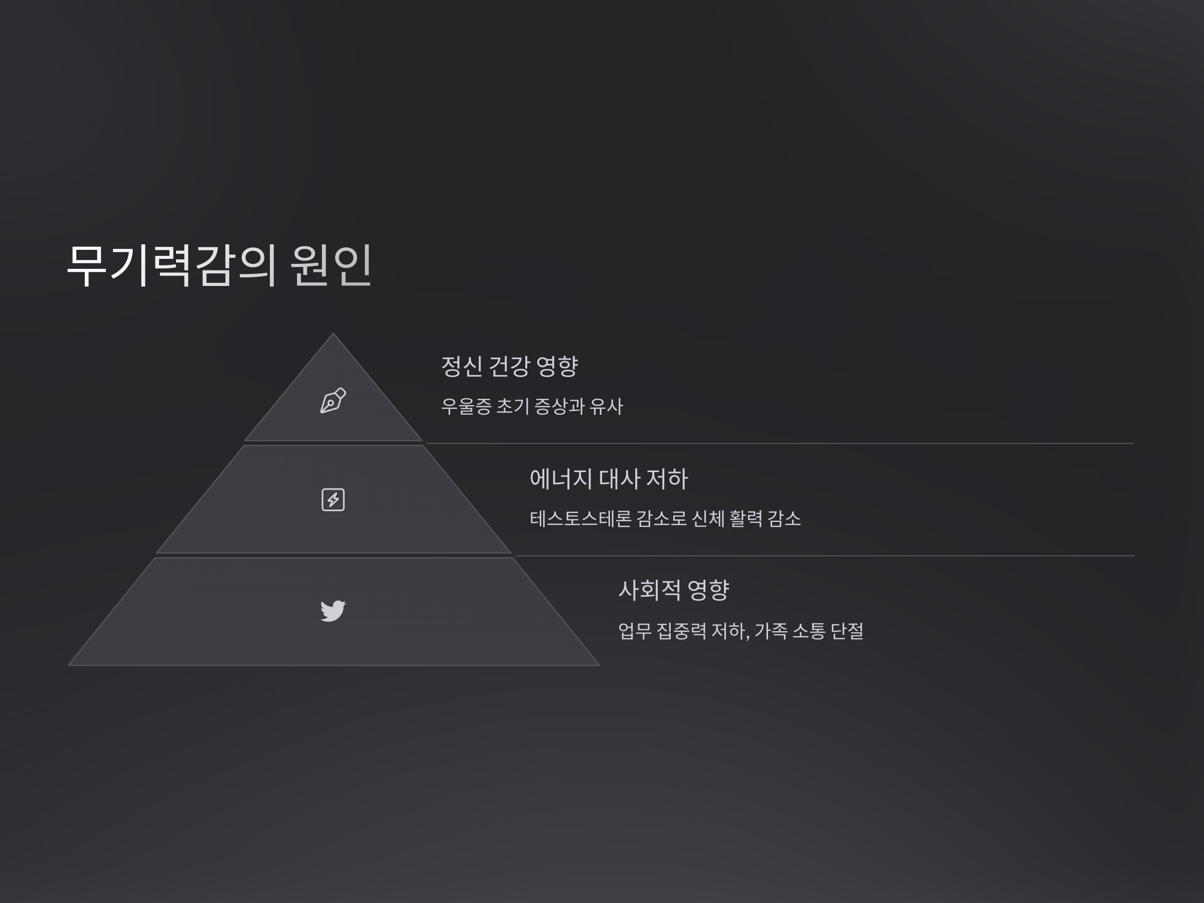 무기력감은 신체적 에너지뿐 아니라 정신적 에너지를 빠르게 소진시켜 일상생활에 큰 지장을 줄 수 있습니다. 실제로 많은 중장년 남성들이 고환 기능 저하를 겪으며 회사 업무의 집중력 저하, 가족 간 소통의 단절, 사회적 위축을 경험하게 됩니다. 이에 따라 근본 원인을 찾아 개선하지 않으면 개인의 삶의 질이 장기적으로 악화될 수 있습니다.