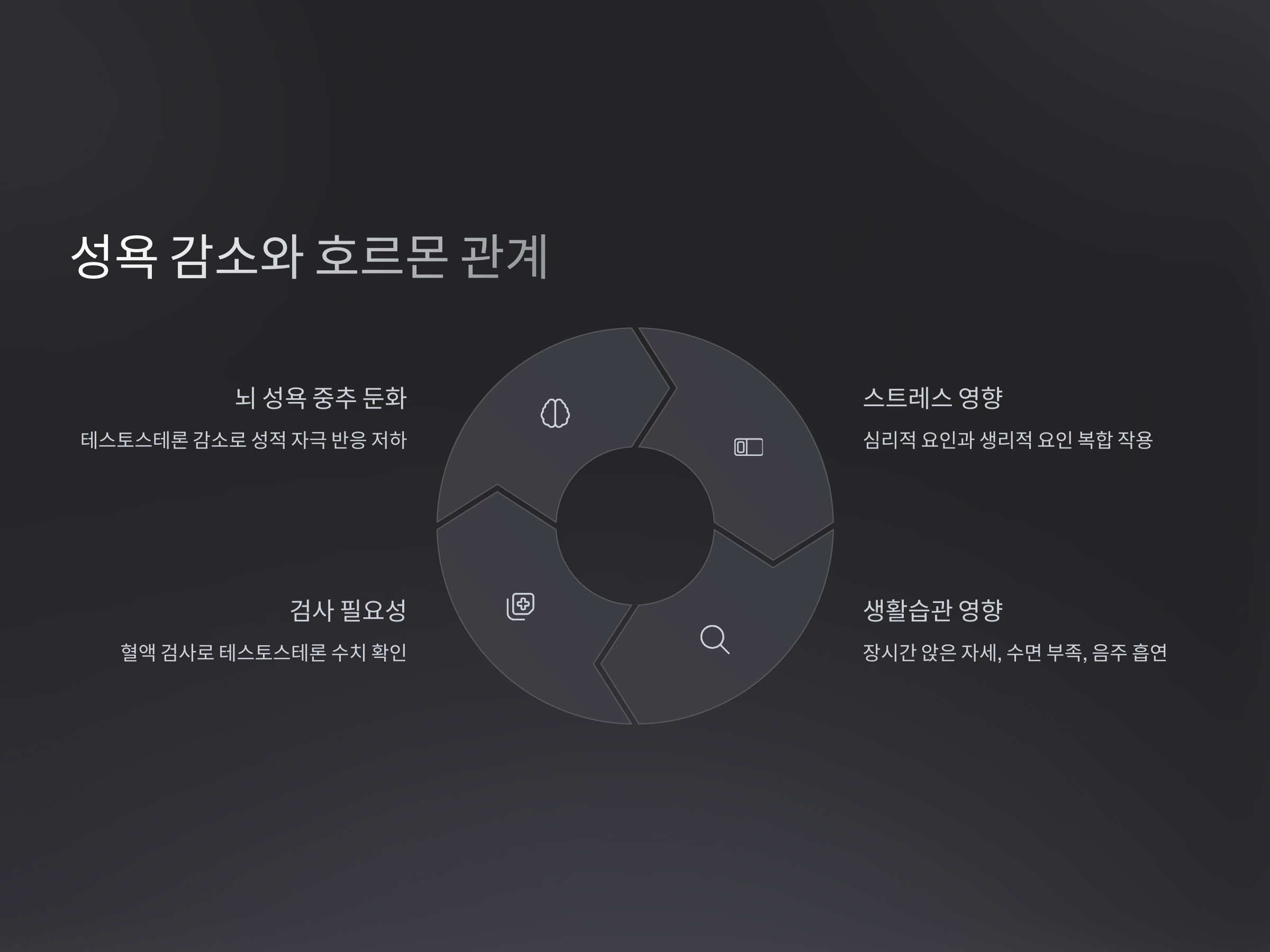 많은 남성들이 성욕이 줄어드는 현상을 단순히 스트레스나 과로 탓으로 돌립니다. 하지만 만성적인 성욕 감소는 단순 피로가 아니라 호르몬 시스템의 이상일 수 있습니다. 테스토스테론 수치가 낮아지면 뇌의 성욕 중추가 둔화되고, 이는 자연스럽게 성적 흥분에 대한 반응 저하로 이어집니다. 이러한 생리적 메커니즘은 심리적인 스트레스와 결합되면서 더욱 복합적인 증상을 유발할 수 있습니다.