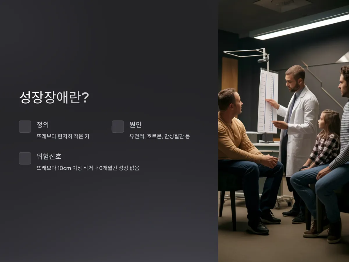 성장장애는 유전적, 호르몬, 만성질환 등 다양한 원인으로 인해 또래 아이들보다 현저히 작은 키를 보이는 상태를 말합니다. 특히 만 2세부터 사춘기 이전까지의 성장곡선이 정체되거나 감소할 경우 전문가의 진료가 필요합니다. 성장장애는 대부분의 경우 아이의 건강한 성장을 방해할 수 있는 근본적인 문제를 동반하기 때문에, 단순한 유전적 단신과는 구분되어야 합니다.