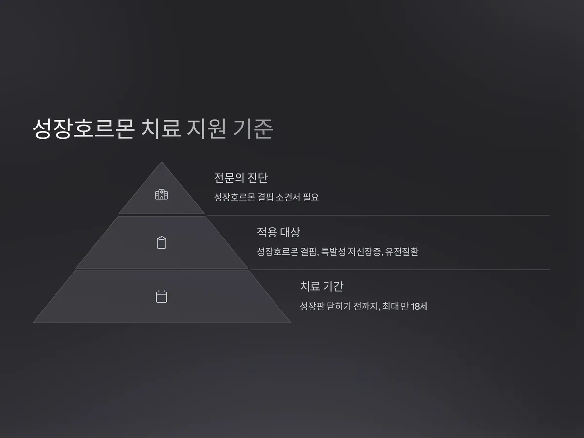 성장호르몬 치료는 다음과 같은 기준을 충족하는 경우 건강보험 적용 및 국가 지원이 가능합니다: