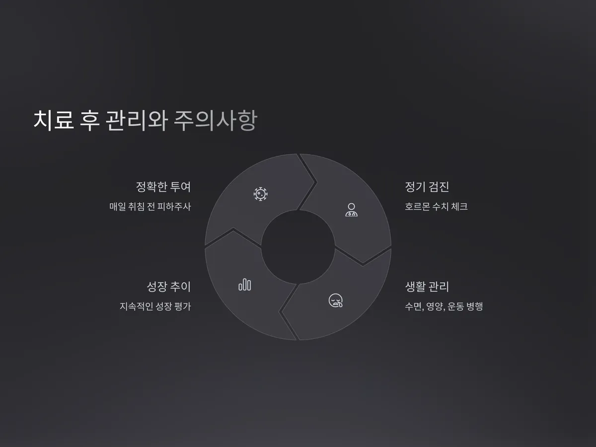 성장호르몬 치료는 일회성으로 끝나는 것이 아닌, 정기적인 추적관찰과 호르몬 수치 체크가 필요합니다. 주사 시기도 정확히 지켜야 하며, 보통 매일 취침 전 피하주사 형태로 투여합니다. 부작용은 드물지만, 관절통이나 혈당 변화가 있을 수 있으므로 정기적인 검사로 조절합니다.