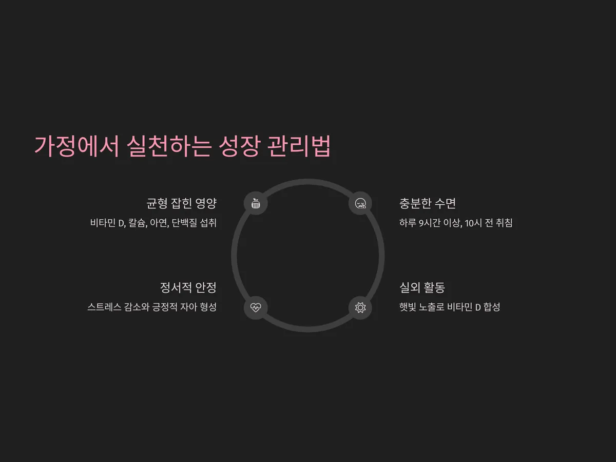 둘째, 충분한 수면은 성장호르몬 분비를 촉진하는 핵심입니다. 초등학생 기준 하루 최소 9시간 이상 수면을 유지해야 하며, 밤 10시 이전에 취침하는 습관이 중요합니다. 셋째, 실외 활동을 통해 햇빛을 쬐는 것은 비타민 D 합성에 도움이 되며, 성장판 자극에도 효과적입니다. 또한 스트레스를 줄이고 긍정적인 자아 개념을 형성할 수 있도록 정서적 안정도 함께 관리해야 합니다.