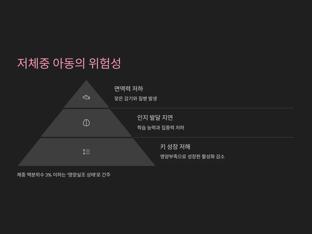 또한 만성 감염이나 심리적 스트레스도 저체중의 원인으로 작용할 수 있습니다. 아이가 지속적으로 식욕이 없거나, 음식 섭취를 거부하는 경우, 전문 심리상담이나 소아정신과 진료도 필요할 수 있습니다. 저체중은 면역력 저하, 잦은 감기, 구강 건강 악화로도 이어지므로 체계적인 관리가 중요합니다.