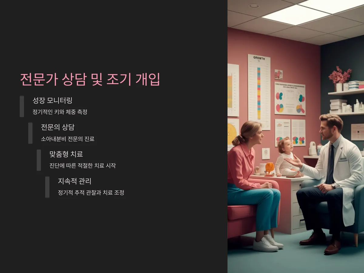 성장 장애는 가능한 조기에 발견하고 개입하는 것이 장기적인 성장 가능성에 가장 큰 영향을 미칩니다. 부모가 느끼기에 단순한 편차로 보일 수 있지만, 반복되는 성장 둔화나 저체중은 반드시 소아내분비 전문의의 상담이 필요합니다. 특히 성장 곡선이 2개 이상 백분위 구간을 하락하거나, 체중과 키 모두 기준치 미달일 경우 적극적인 진단과 개입이 요구됩니다.