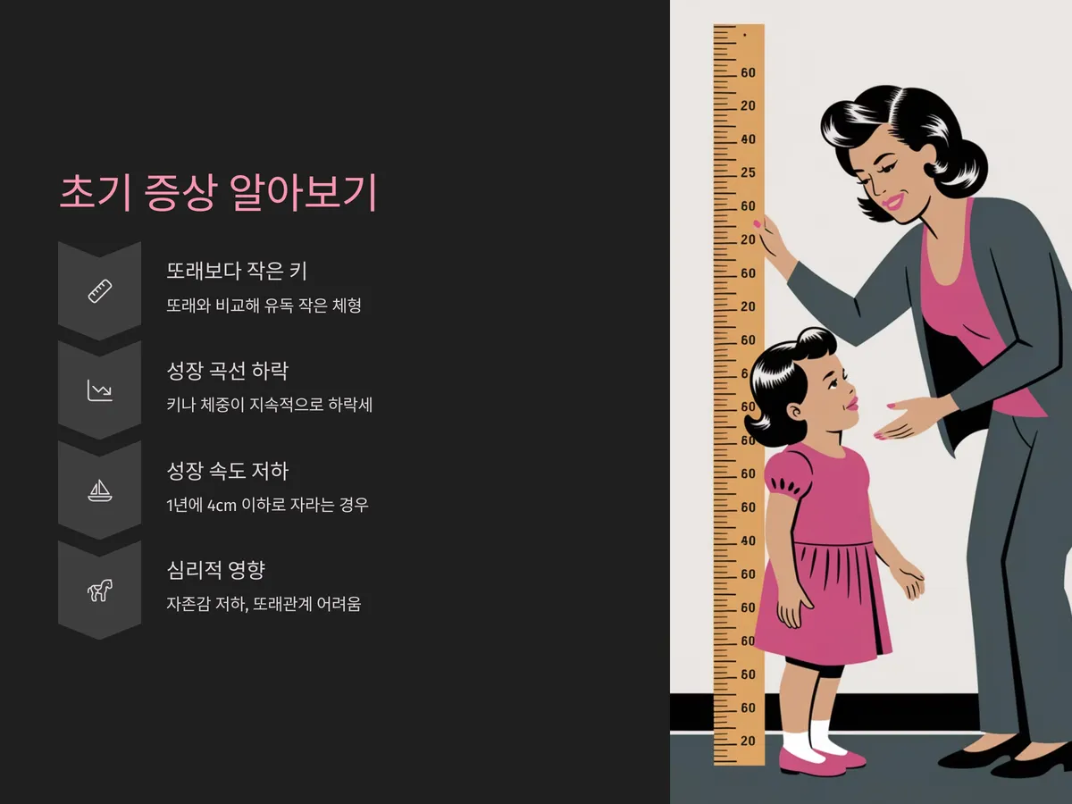 초기 증상은 매우 미세하고 알아차리기 어려울 수 있습니다. 아이가 또래보다 유독 작아 보이거나, 성장 곡선에서 키나 체중이 계속 하락세를 보인다면 반드시 전문의의 진단을 받아야 합니다. 특히 1년에 4cm 이하로 자라는 경우에는 경고 신호일 수 있습니다. 성장 둔화가 진행되면 자존감 저하, 또래관계의 어려움 등 심리적 문제로도 이어질 수 있어 조기 발견이 핵심입니다.