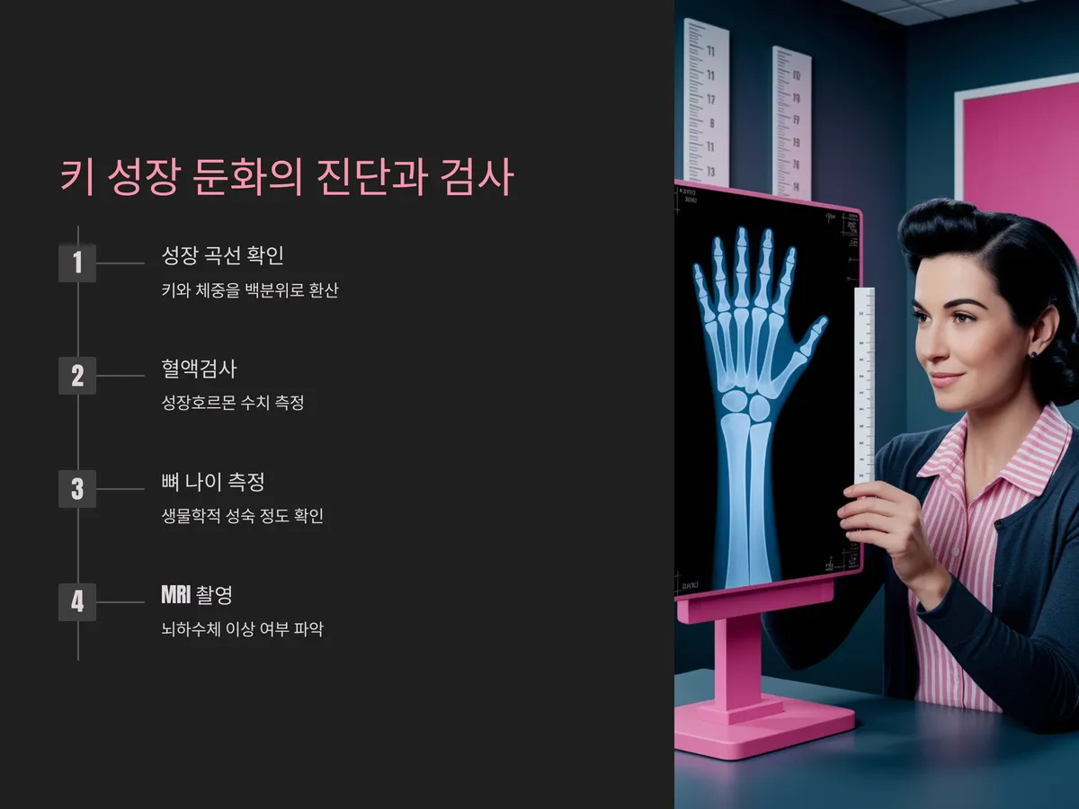 아이의 키 성장 둔화가 의심되면 병원에서는 키와 체중을 백분위로 환산해 성장 곡선을 확인하고, 필요 시 다양한 검사를 시행합니다. 기본적인 혈액검사를 통해 성장호르몬 수치를 측정하고, 뼈 나이 측정을 통해 아이의 생물학적 성숙 정도를 확인합니다. MRI 촬영을 통해 뇌하수체 이상 여부를 파악하기도 합니다.