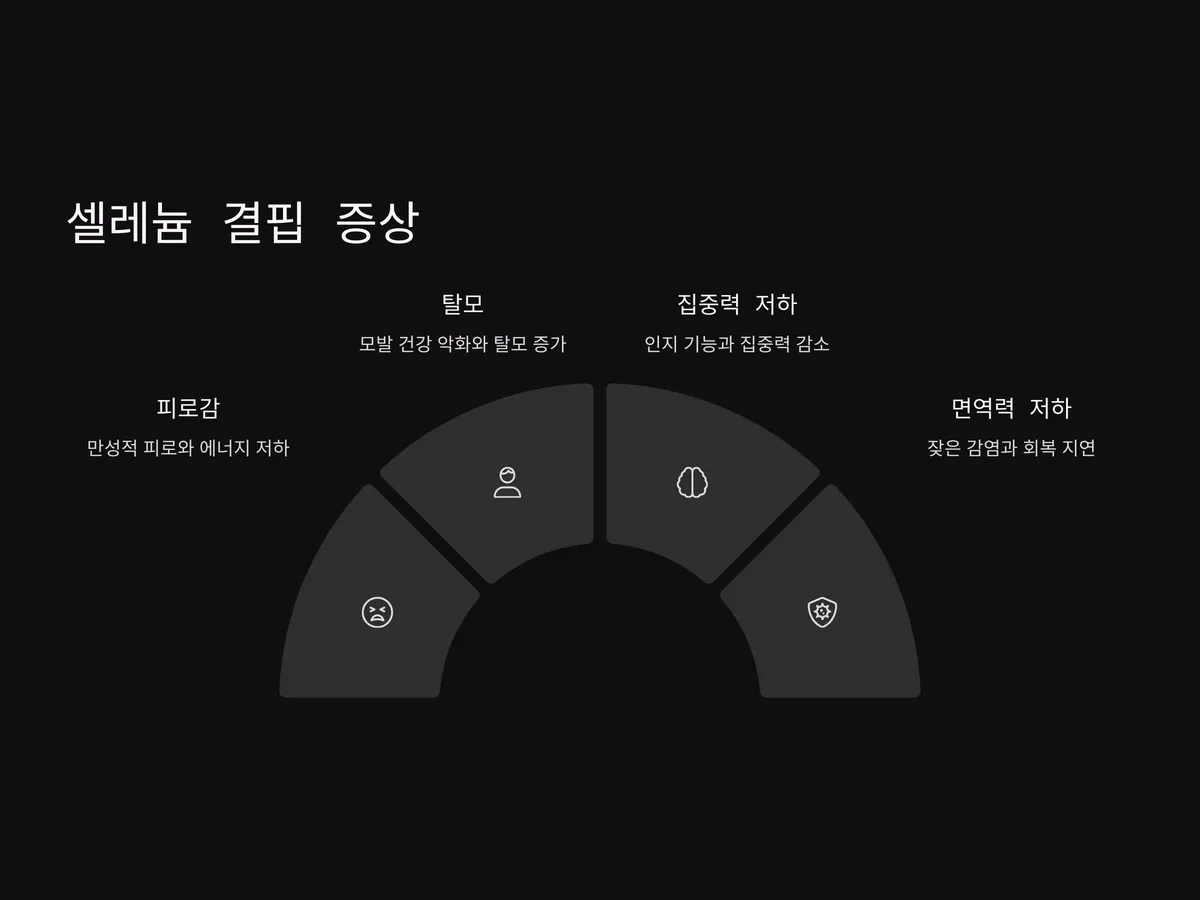 셀레늄의 결핍은 피로, 면역력 저하, 탈모, 집중력 저하 등 다양한 증상으로 나타날 수 있습니다. 특히 갑상선 기능 저하증 환자나 하시모토 갑상선염 환자에게 셀레늄 보충은 증상 개선에 도움이 된다는 임상연구가 존재합니다. 또한 셀레늄은 바이러스 감염 방지에도 도움을 줄 수 있어, 최근 코로나19 시국 이후로 다시 주목받고 있습니다.