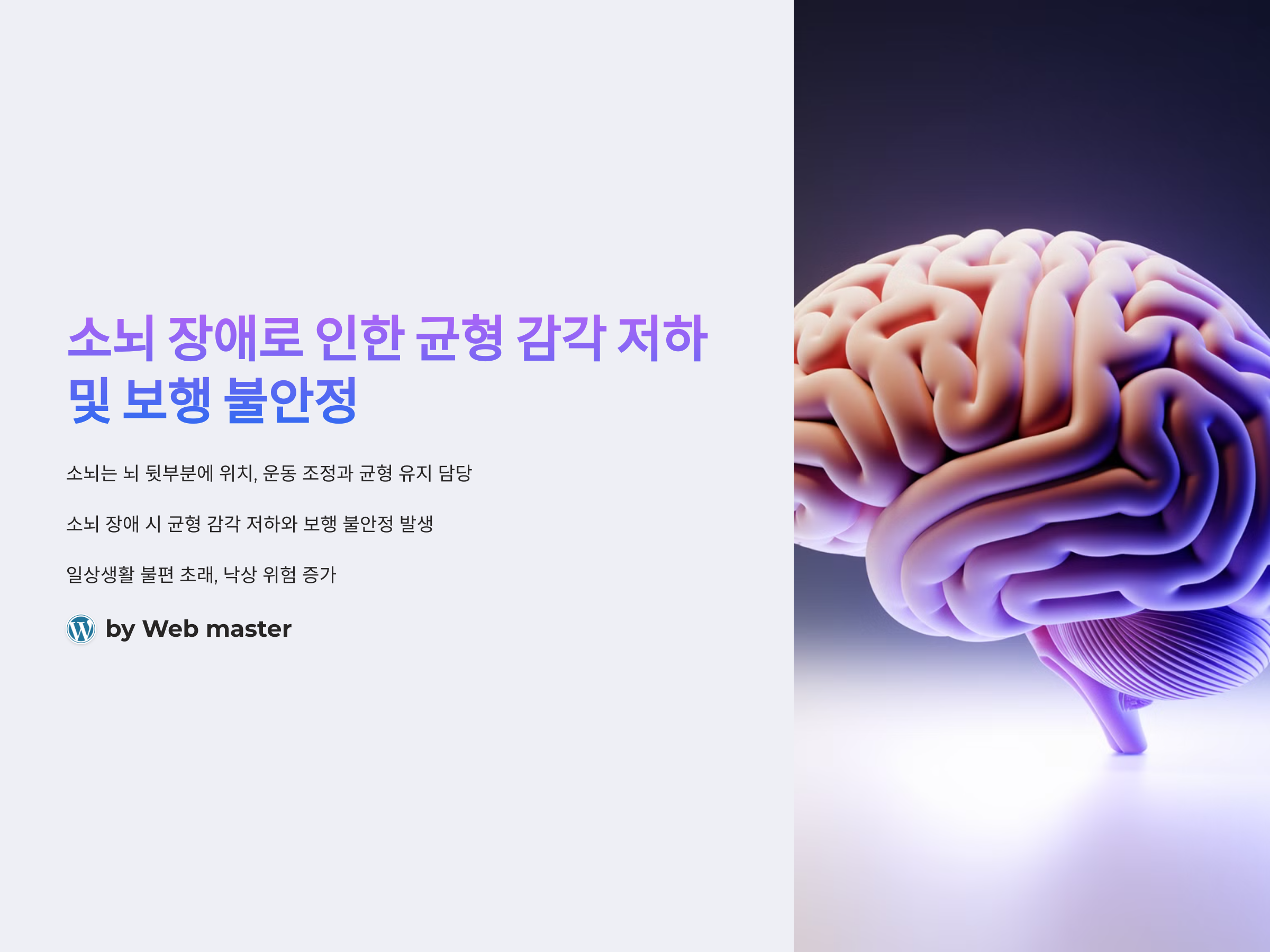 소뇌는 신체의 운동 기능을 담당하는 중요한 뇌 부위입니다. 주로 균형을 잡고, 몸의 위치를 감지하며, 미세한 운동을 조정하는 역할을 합니다. 소뇌가 손상되면 운동 조정 능력이 저하되고, 이로 인해 균형을 잡는 데 어려움이 생깁니다. 소뇌 장애는 다양한 원인에 의해 발생할 수 있는데, 대표적으로는 뇌졸중, 뇌염, 신경퇴행성 질환 등이 있습니다. 소뇌에 문제가 생기면 몸의 위치를 잘 감지하지 못하거나, 빠르게 움직이는 물체를 추적하기 어려워지기도 합니다.