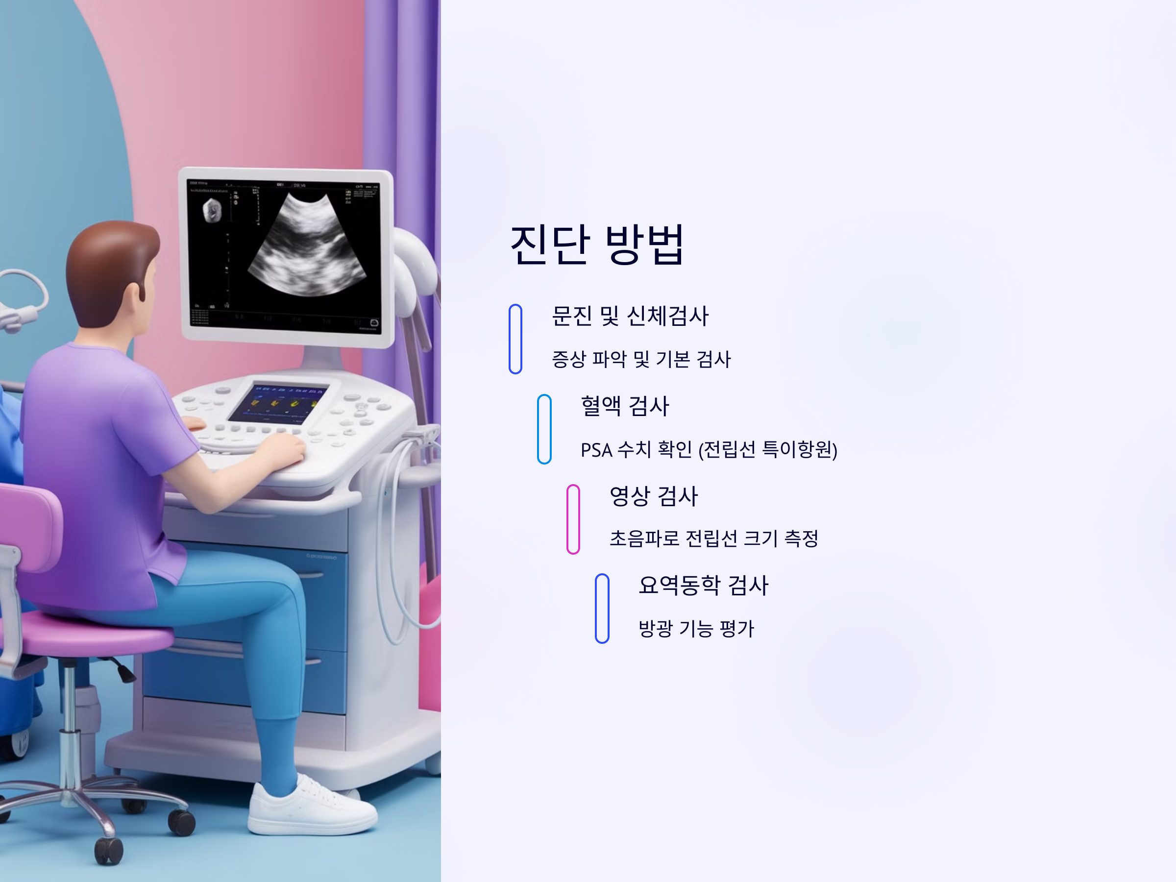 - 전립선 비대증: 주로 남성에게 발생하며, 전립선의 크기가 커져서 소변 배출이 방해되는 상태입니다. 배뇨 후 잔뇨감이 남으며, 치료는 약물 치료나 수술적 방법을 통해 진행됩니다.