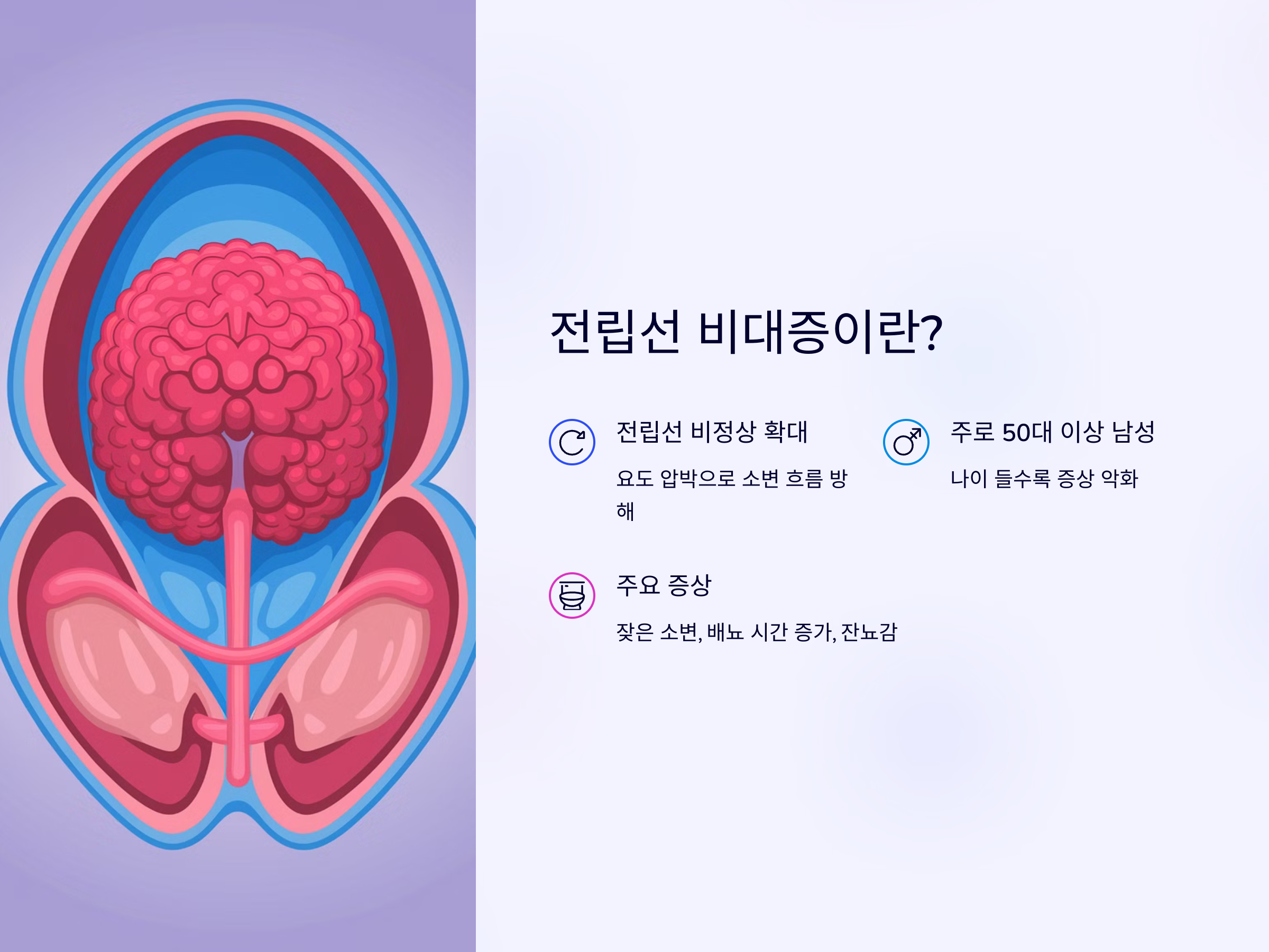 전립선 비대증(BPH, Benign Prostatic Hyperplasia)은 전립선이 비정상적으로 커지면서 요도를 압박하는 상태를 말합니다. 이로 인해 소변의 흐름이 방해받고, 배뇨 후에도 잔뇨감이 남을 수 있습니다. 전립선 비대증은 주로 50대 이상의 남성에게 흔히 발생하는 문제로, 전립선이 커짐에 따라 요도의 일부가 좁아지고 소변을 완전히 배출하기 어려운 상태가 됩니다.
