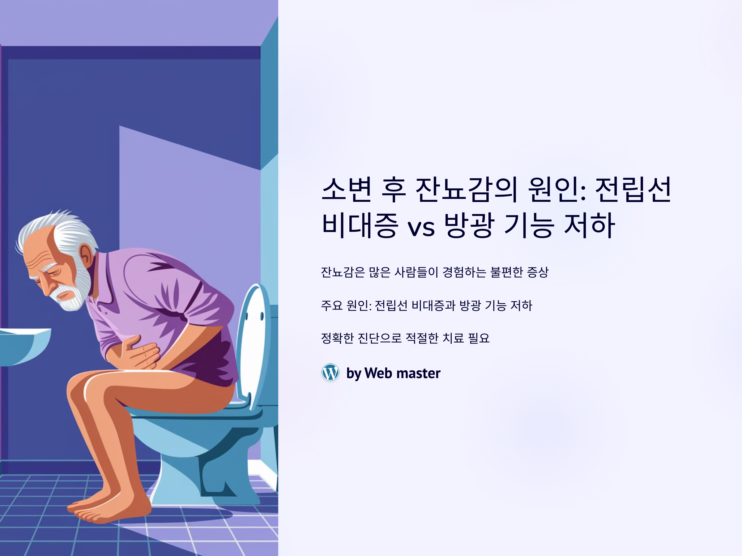 소변을 보고 나서도 잔뇨감이 남는 증상은 전립선 비대증과 방광 기능 저하 등 여러 가지 원인에 의해 발생할 수 있습니다. 이 두 가지 문제는 비슷한 증상을 보일 수 있지만, 그 원인과 치료 방법에서 차이가 있습니다. 만약 잔뇨감이 지속된다면, 정확한 진단을 통해 원인을 파악하고 적절한 치료를 받는 것이 중요합니다. 이를 통해 보다 건강한 배뇨 습관을 유지하고, 불편함을 해소할 수 있을 것입니다.