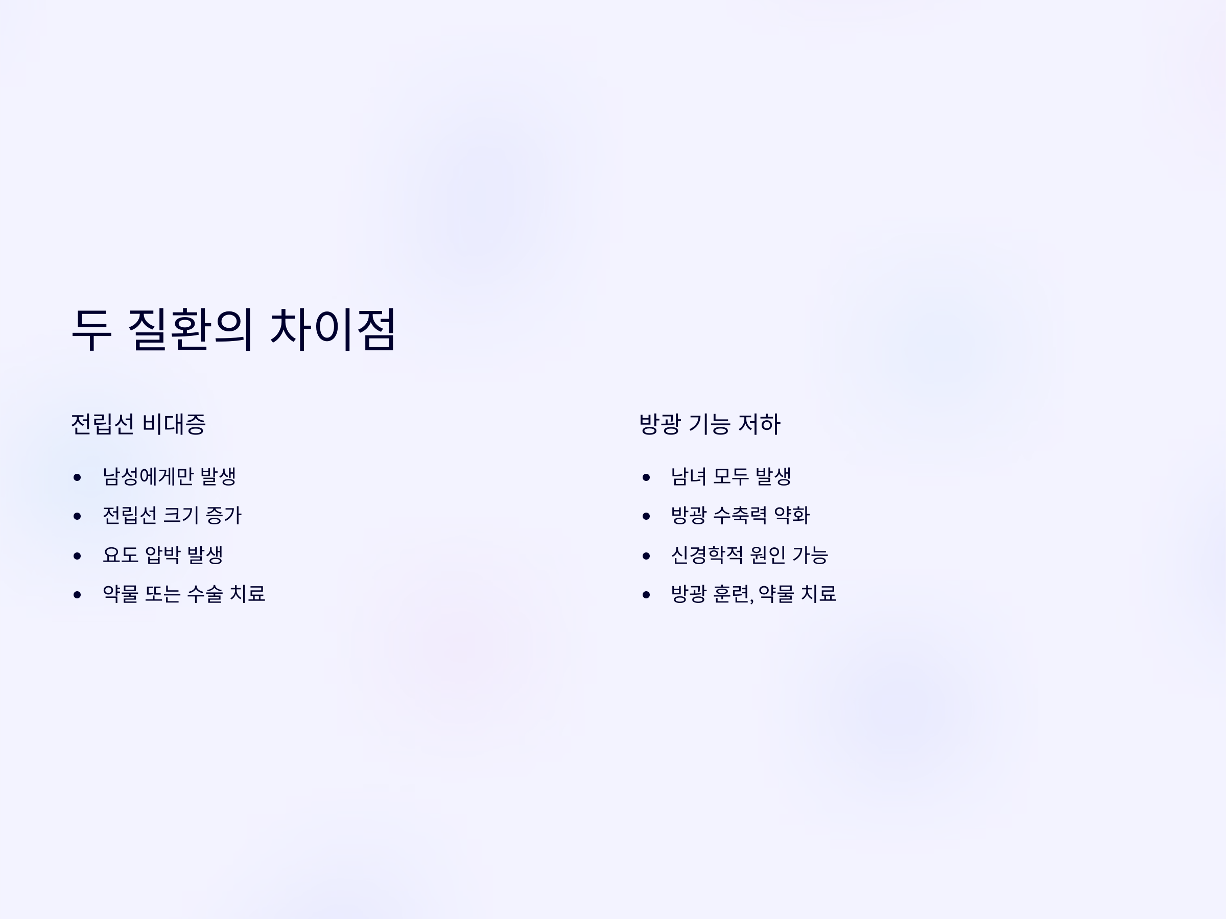 전립선 비대증과 방광 기능 저하는 비슷한 증상을 보일 수 있지만, 원인과 치료 방법에서 차이가 있습니다. 전립선 비대증은 주로 남성에게서 발생하며, 전립선이 커져서 요도를 압박하는 상태입니다. 반면 방광 기능 저하는 방광 자체의 수축 능력이 떨어져서 발생하는 문제로, 남녀 모두에서 발생할 수 있습니다.