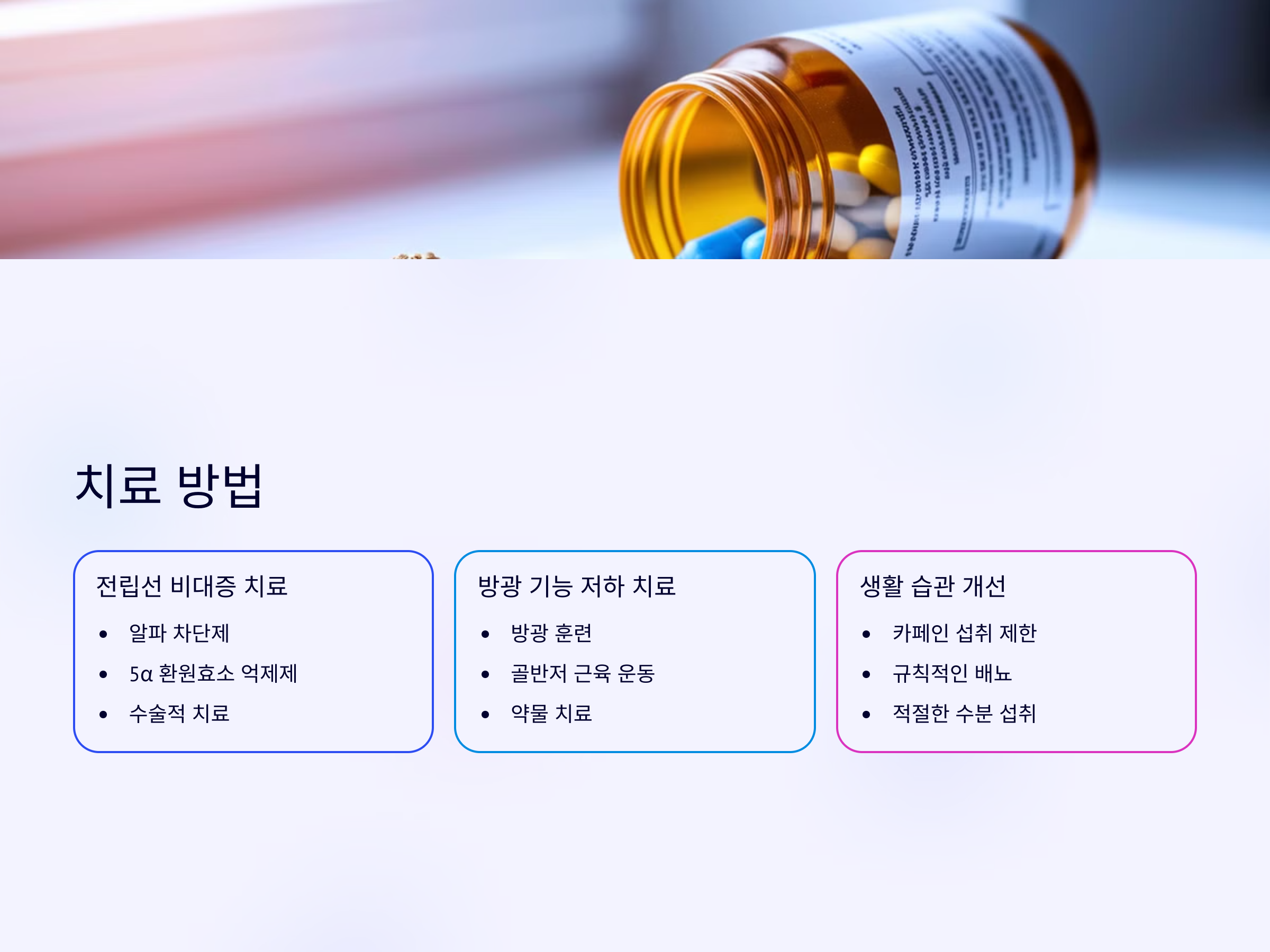 - 전립선 비대증: 약물 치료, 알파 차단제, 5α 환원효소 억제제 등을 사용할 수 있으며, 증상이 심한 경우에는 수술적 치료가 필요할 수 있습니다.