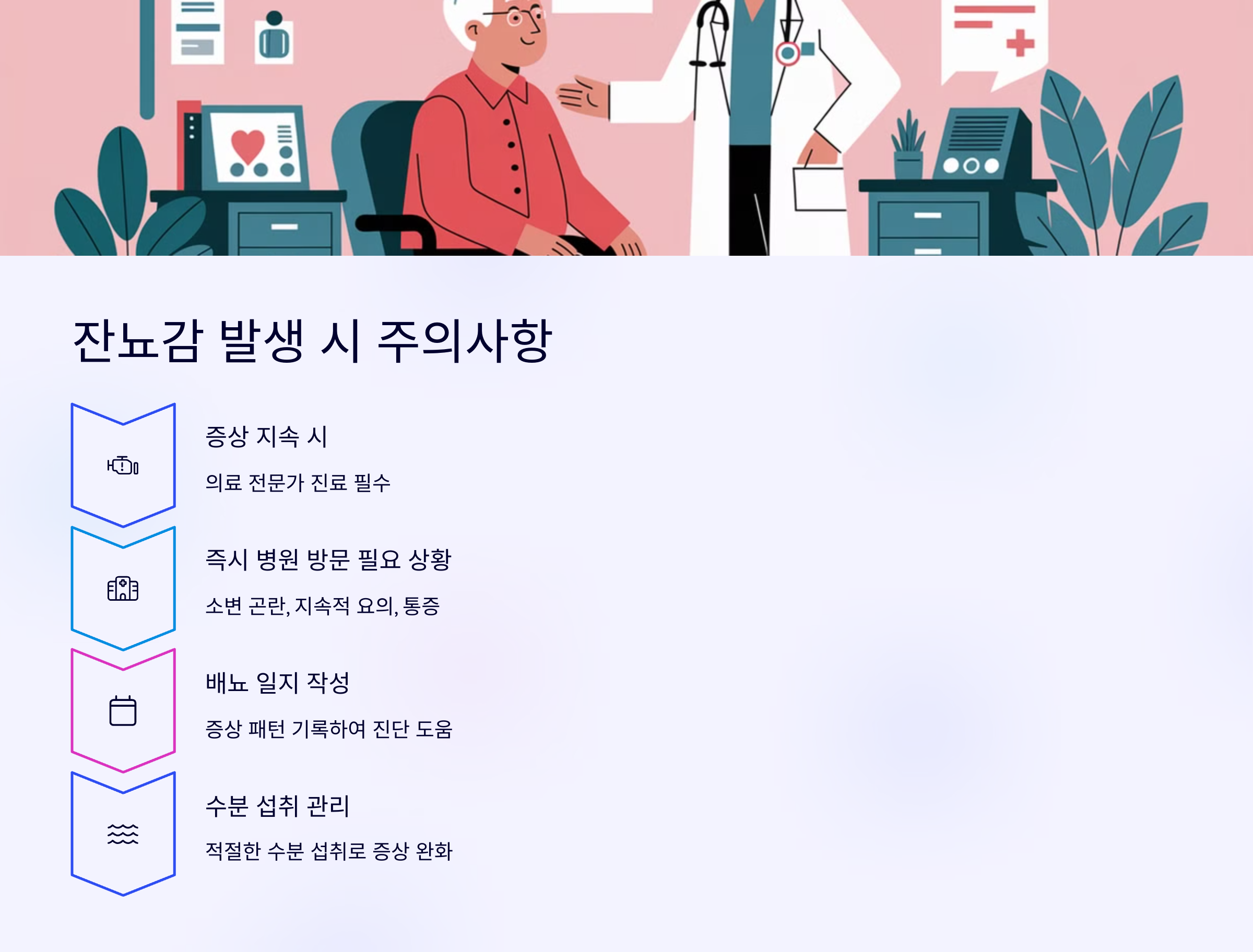 소변을 보고 나서도 잔뇨감이 남는 경우, 반드시 의료 전문가의 진료를 받는 것이 중요합니다. 잔뇨감은 전립선 비대증이나 방광 기능 저하 외에도 다양한 원인으로 발생할 수 있습니다. 만약 증상이 지속되거나 심해지면, 배뇨 관련 질환이나 다른 건강 문제의 징후일 수 있기 때문에 빠른 치료가 필요합니다.