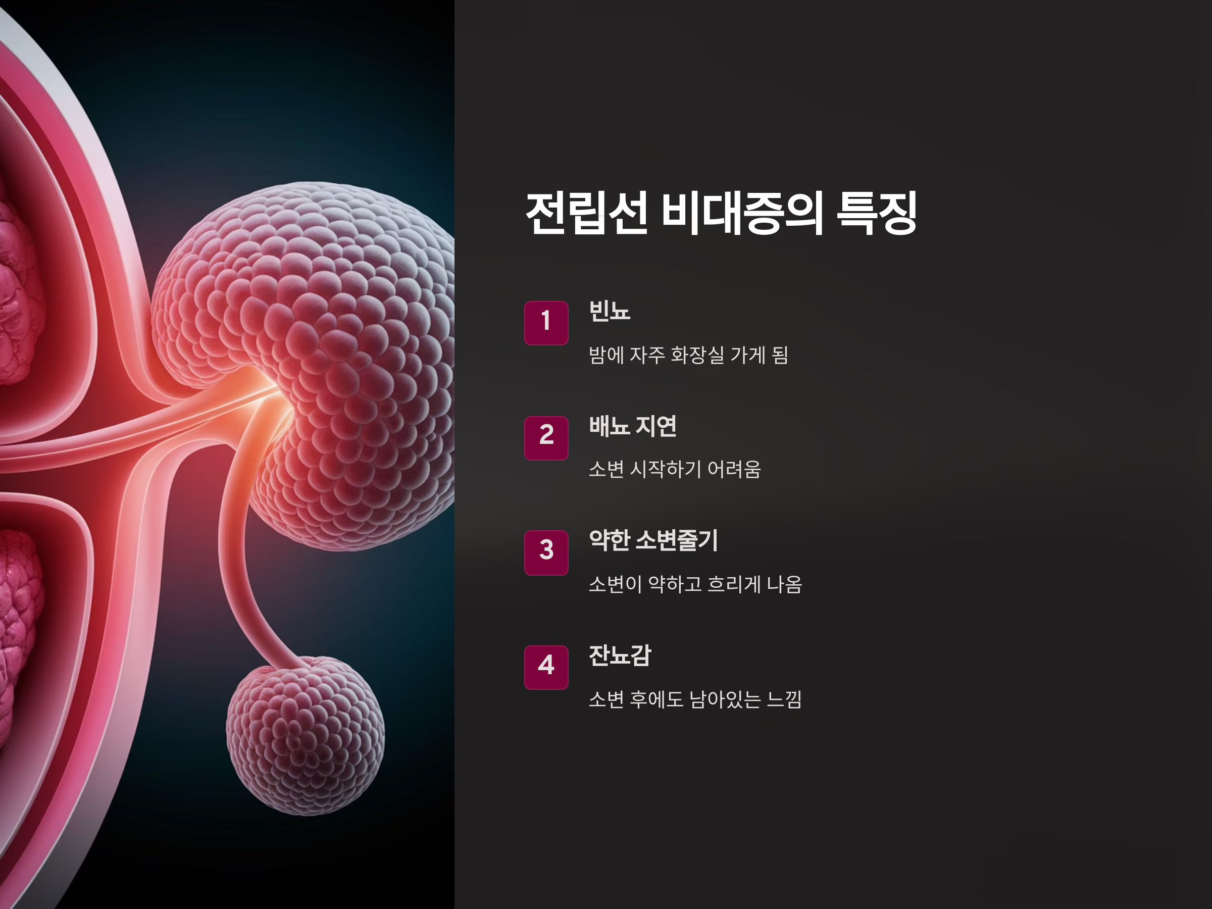 전립선 비대증은 주로 중년 이상의 남성에서 발생하는 질환으로, 전립선이 커져서 요도와 방광을 압박하게 됩니다. 이로 인해 배뇨에 어려움을 겪게 되고, 잔뇨감도 자주 발생할 수 있습니다. 전립선 비대증의 주요 증상은 다음과 같습니다: