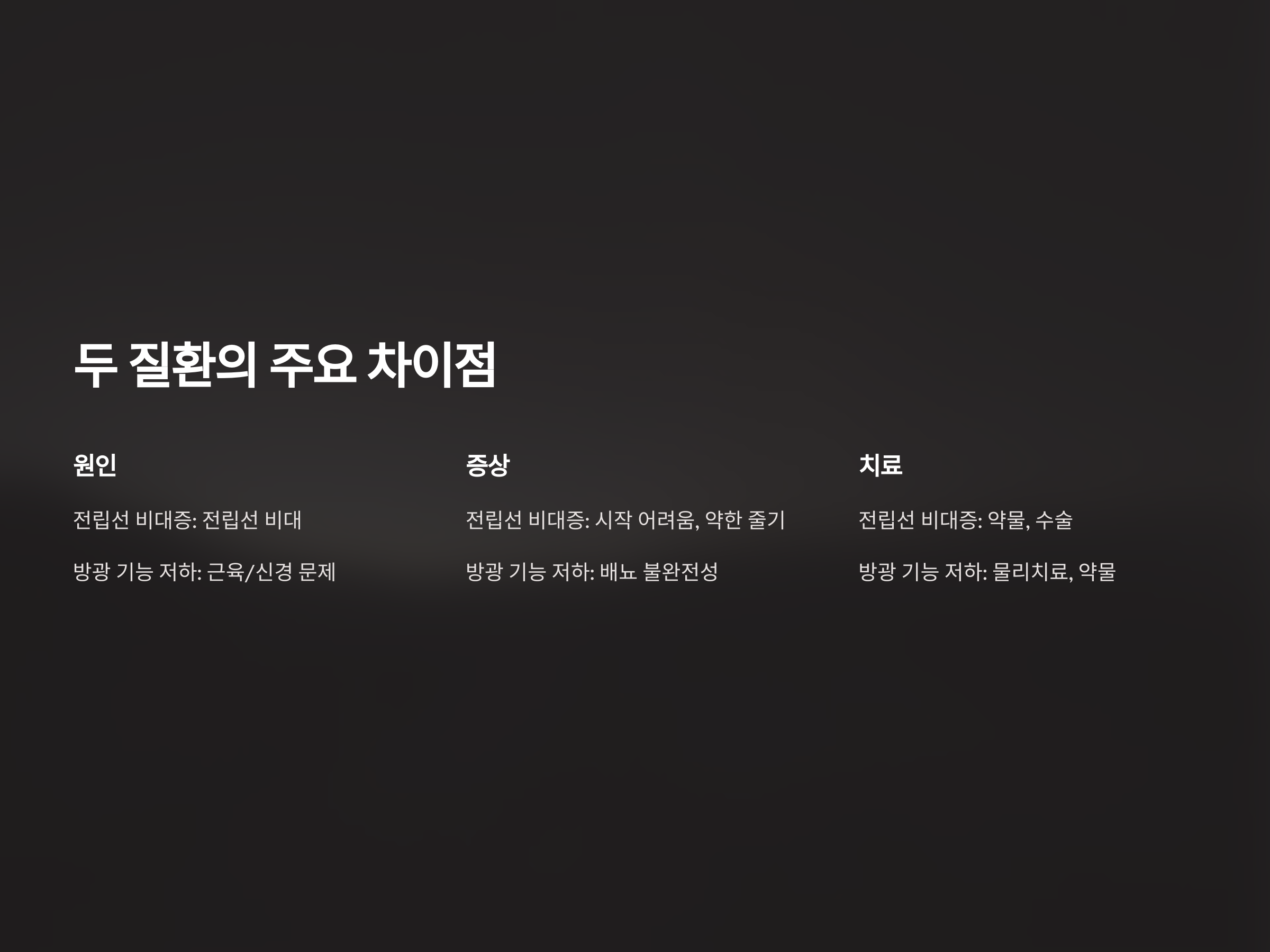 전립선 비대증과 방광 기능 저하는 비슷한 증상을 보일 수 있지만, 원인과 치료 방법에서 차이가 있습니다. 두 질환의 주요 차이점은 다음과 같습니다: