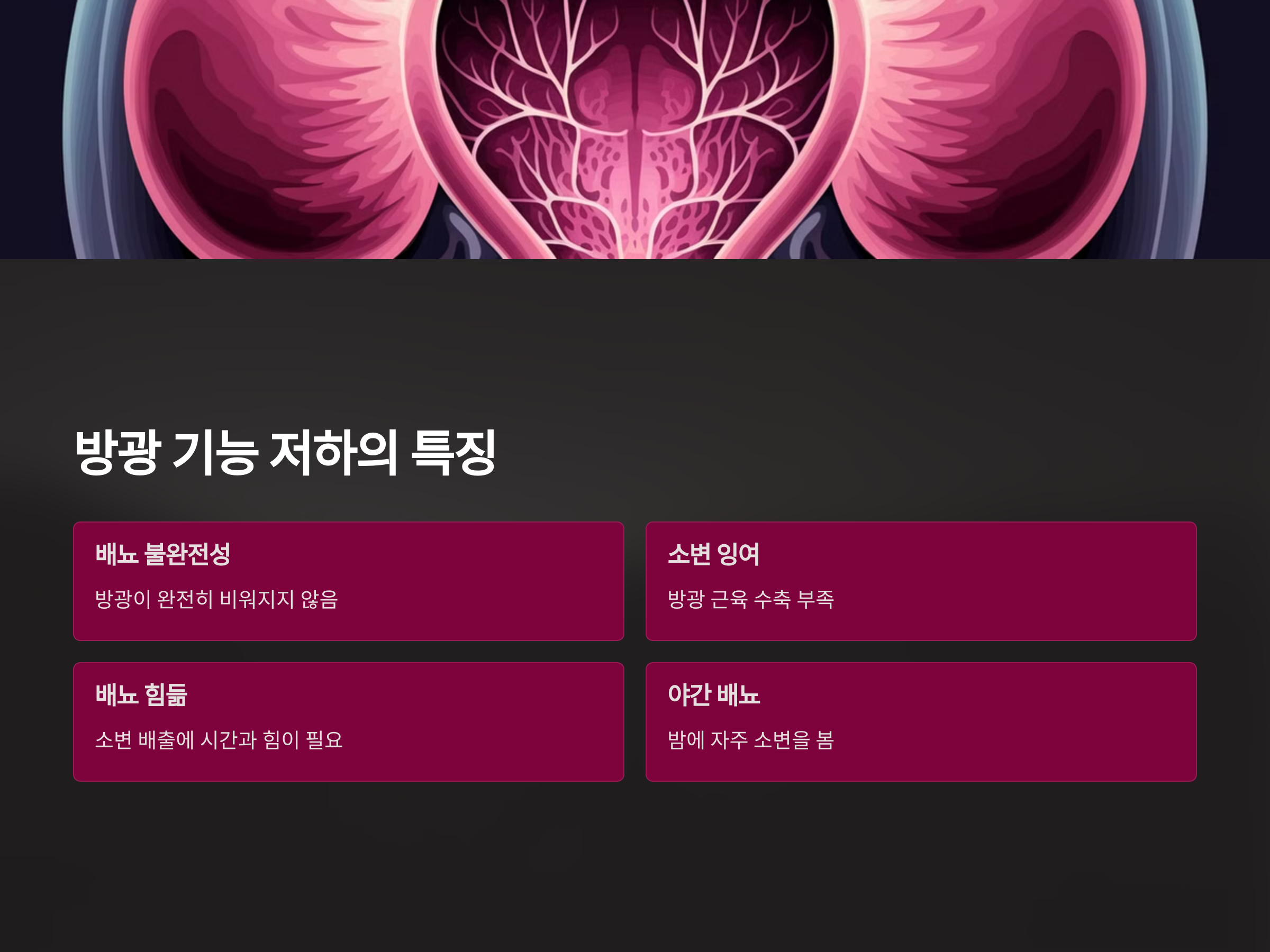 방광 기능 저하는 방광이 제대로 작동하지 않아 배뇨에 문제가 생기는 상태를 의미합니다. 이는 신경학적 문제나 방광의 근육 약화로 인해 발생할 수 있습니다. 방광 기능 저하의 주요 증상은 다음과 같습니다: