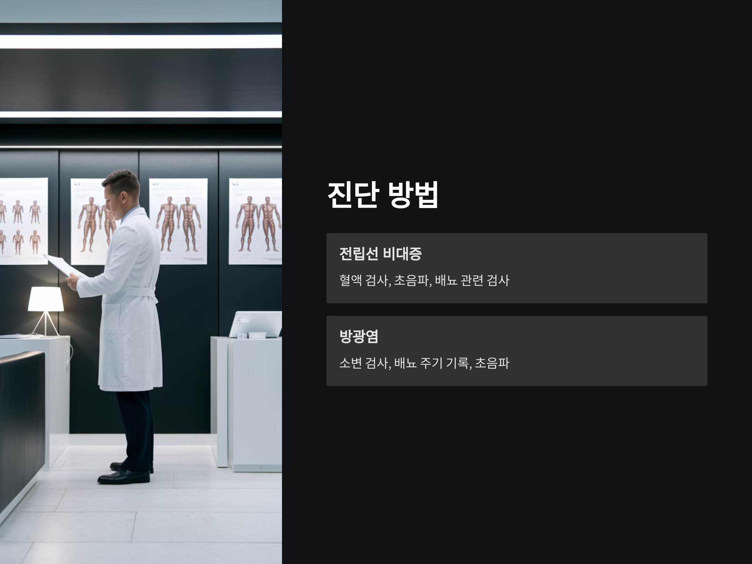 - 전립선 비대증: 진단을 위해서는 혈액 검사, 초음파 검사, 배뇨 관련 검사 등이 필요할 수 있습니다. 이를 통해 전립선의 크기나 배뇨 기능 상태를 확인합니다.