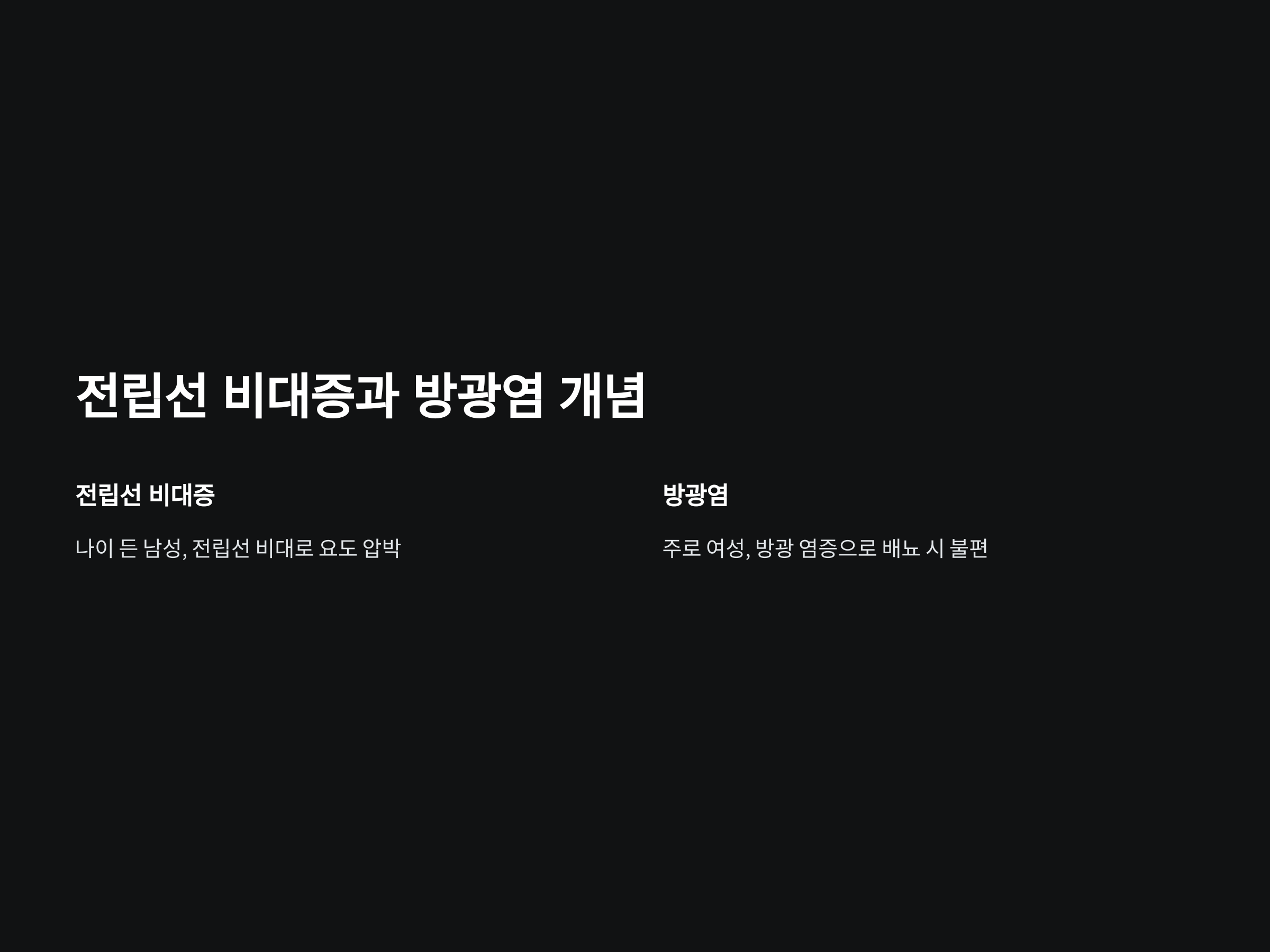 전립선 비대증(BPH, Benign Prostatic Hyperplasia)은 주로 나이가 든 남성들에게 발생하는 질환으로, 전립선이 비대해져 요도를 압박하는 상태입니다. 이로 인해 소변을 배출하는데 어려움이 생기고, 자주 소변을 보거나, 소변이 끊어지지 않고 계속 나오는 느낌을 받는 경우가 많습니다. 반면, 방광염은 주로 여성에서 발생하는 질환으로, 방광에 염증이 생겨 배뇨 시 통증이나 불편감을 유발합니다.