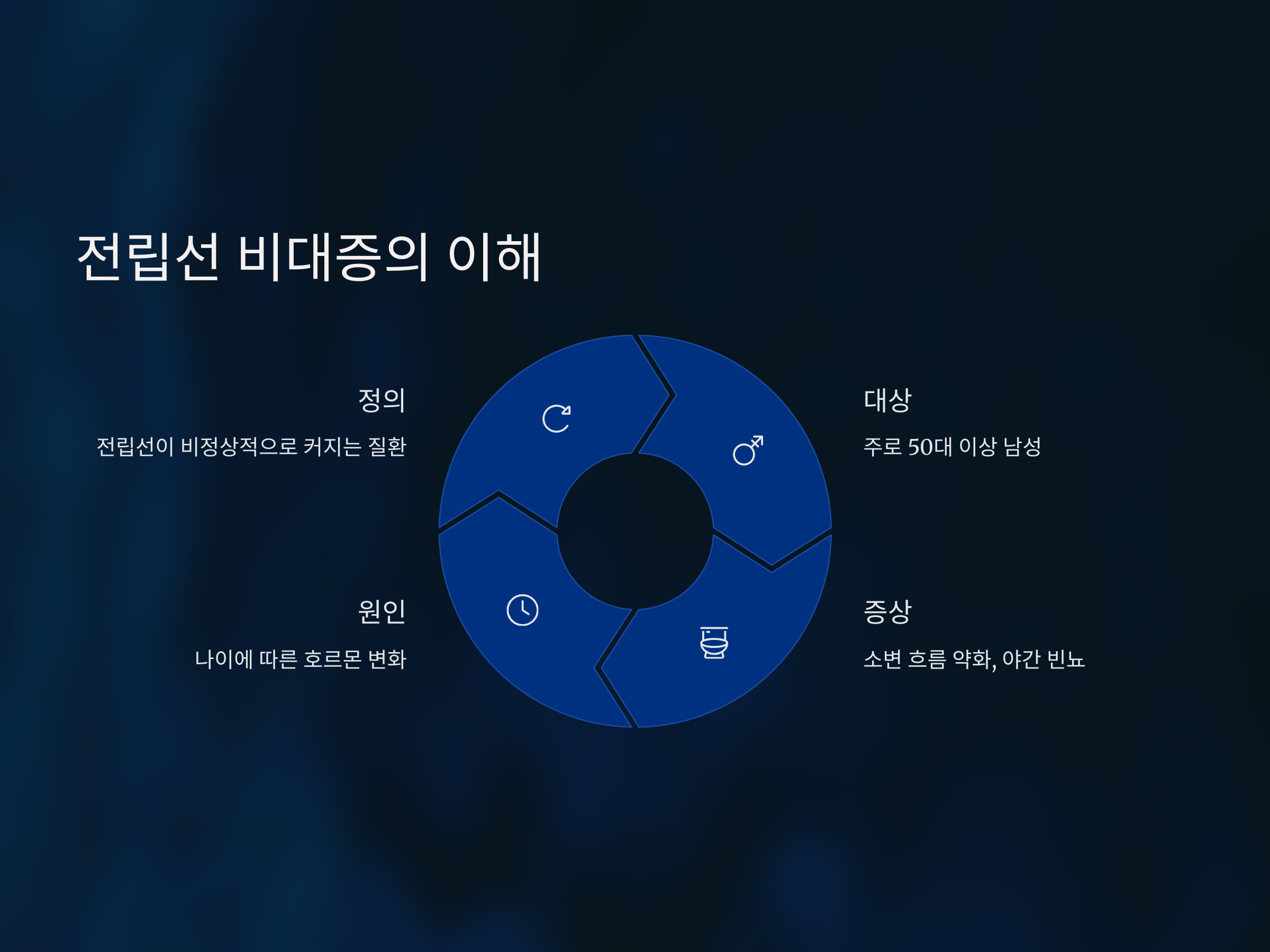 전립선 비대증(BPH, Benign Prostatic Hyperplasia)은 남성의 전립선이 비정상적으로 커지는 질환입니다. 전립선은 소변의 흐름을 조절하는 역할을 하는데, 전립선이 커지면 요도를 압박하게 되어 소변의 흐름에 어려움이 생깁니다. 주로 50대 이상의 남성에게 발생하며, 나이가 들면서 호르몬 변화로 인해 전립선이 비대해지는 경향이 있습니다.