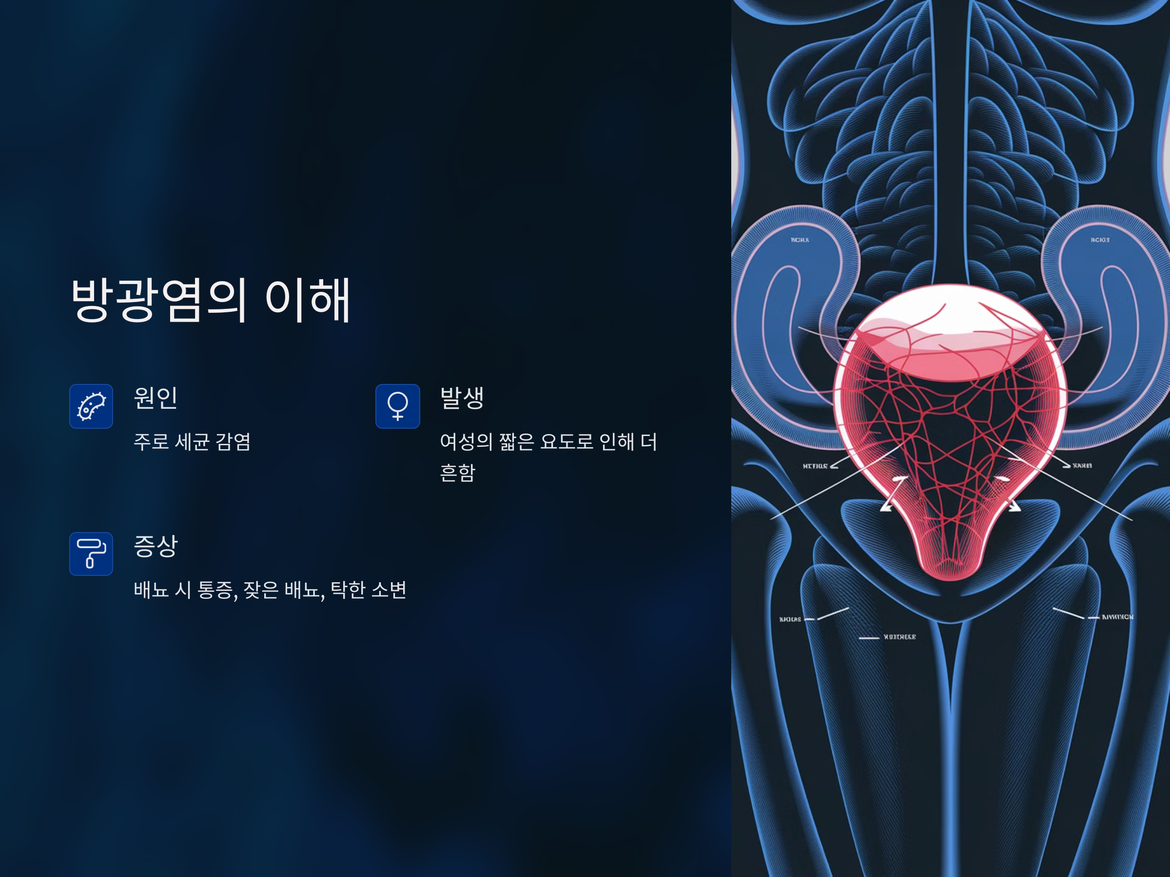방광염은 방광에 염증이 생기는 질환으로, 주로 세균 감염에 의해 발생합니다. 이 질환은 주로 여성에서 발생하는데, 여성의 배뇨기 구조가 남성보다 짧아 세균이 방광에 쉽게 침투할 수 있기 때문입니다. 방광염의 주요 증상으로는 배뇨 시 통증, 잦은 배뇨, 소변이 탁하거나 불쾌한 냄새를 동반하는 경우가 있습니다. 또한, 일부 환자는 복부 아래쪽에 불쾌감을 느끼거나 피가 섞인 소변을 보기도 합니다.