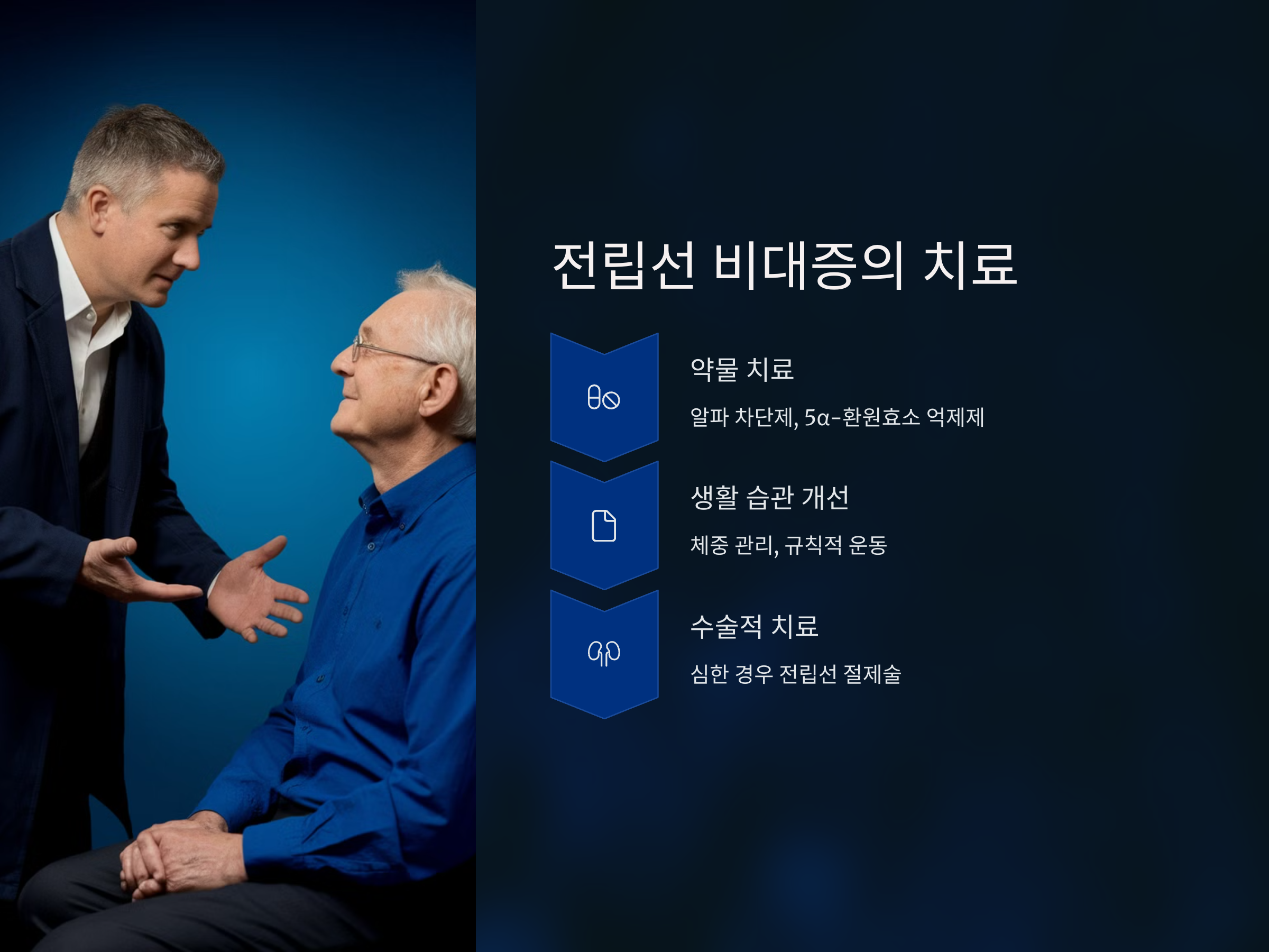 전립선 비대증의 치료는 약물 치료, 생활 습관의 개선, 심한 경우 수술로 진행될 수 있습니다. 약물로는 알파 차단제나 5α-환원효소 억제제를 사용해 전립선 크기를 줄이고 배뇨를 개선할 수 있습니다. 수술적 치료로는 전립선 절제술이 있으며, 증상이 매우 심한 경우 고려될 수 있습니다. 또한, 체중 관리와 규칙적인 운동을 통해 증상을 완화할 수 있습니다.