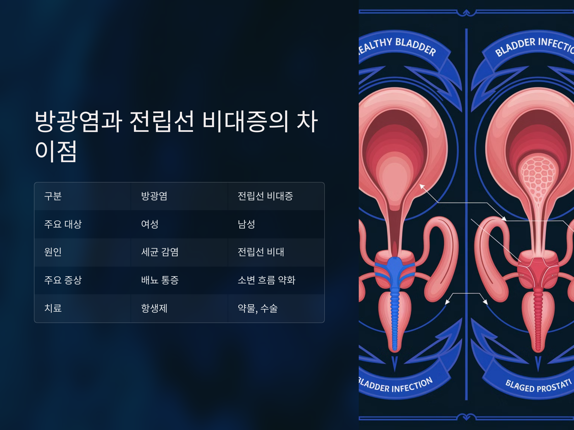 방광염과 전립선 비대증은 모두 배뇨 시 불편함을 일으킬 수 있지만, 그 원인과 증상, 치료 방법에서 큰 차이가 있습니다. 방광염은 주로 세균 감염에 의한 염증으로, 주로 여성에게 영향을 미칩니다. 배뇨 시 통증과 잦은 배뇨가 특징이며, 항생제를 통한 치료가 필요합니다. 반면 전립선 비대증은 주로 나이가 든 남성에게 영향을 미치며, 전립선이 커져 요도를 압박하는 것이 원인입니다. 소변의 흐름이 약해지고, 자주 소변을 보게 되는 증상이 주로 나타납니다.