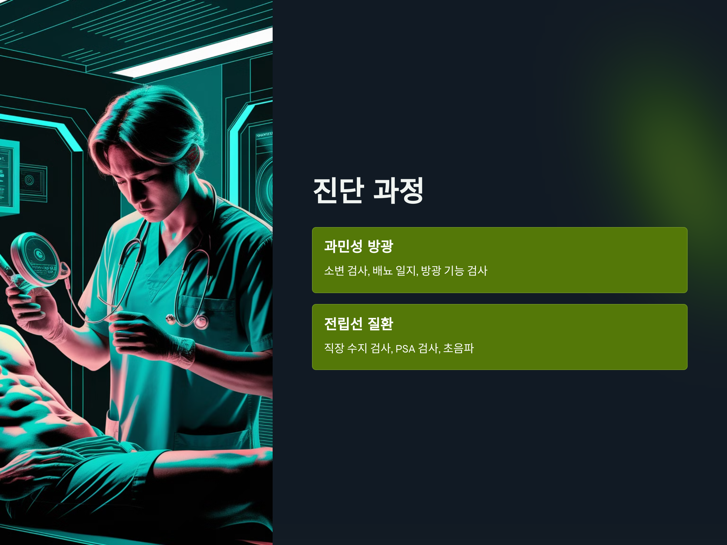 - 과민성 방광: 소변 검사, 배뇨 일지 작성, 방광의 기능 검사가 필요할 수 있습니다.
