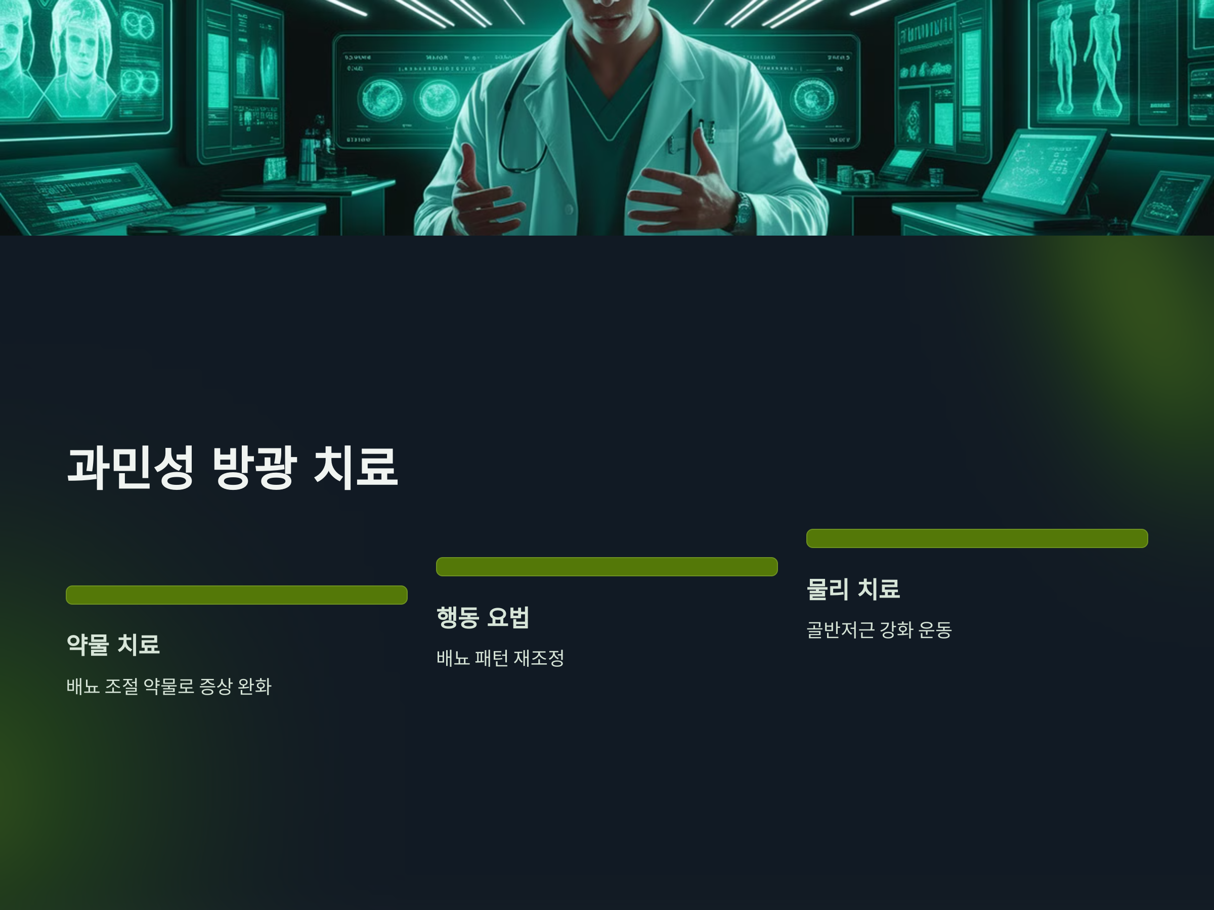 과민성 방광을 관리하는 방법으로는 배뇨 패턴을 조절하는 행동 요법, 약물 치료, 그리고 물리 치료가 포함됩니다. 일부 경우에는 전기 자극 치료나 수술이 필요할 수 있습니다.