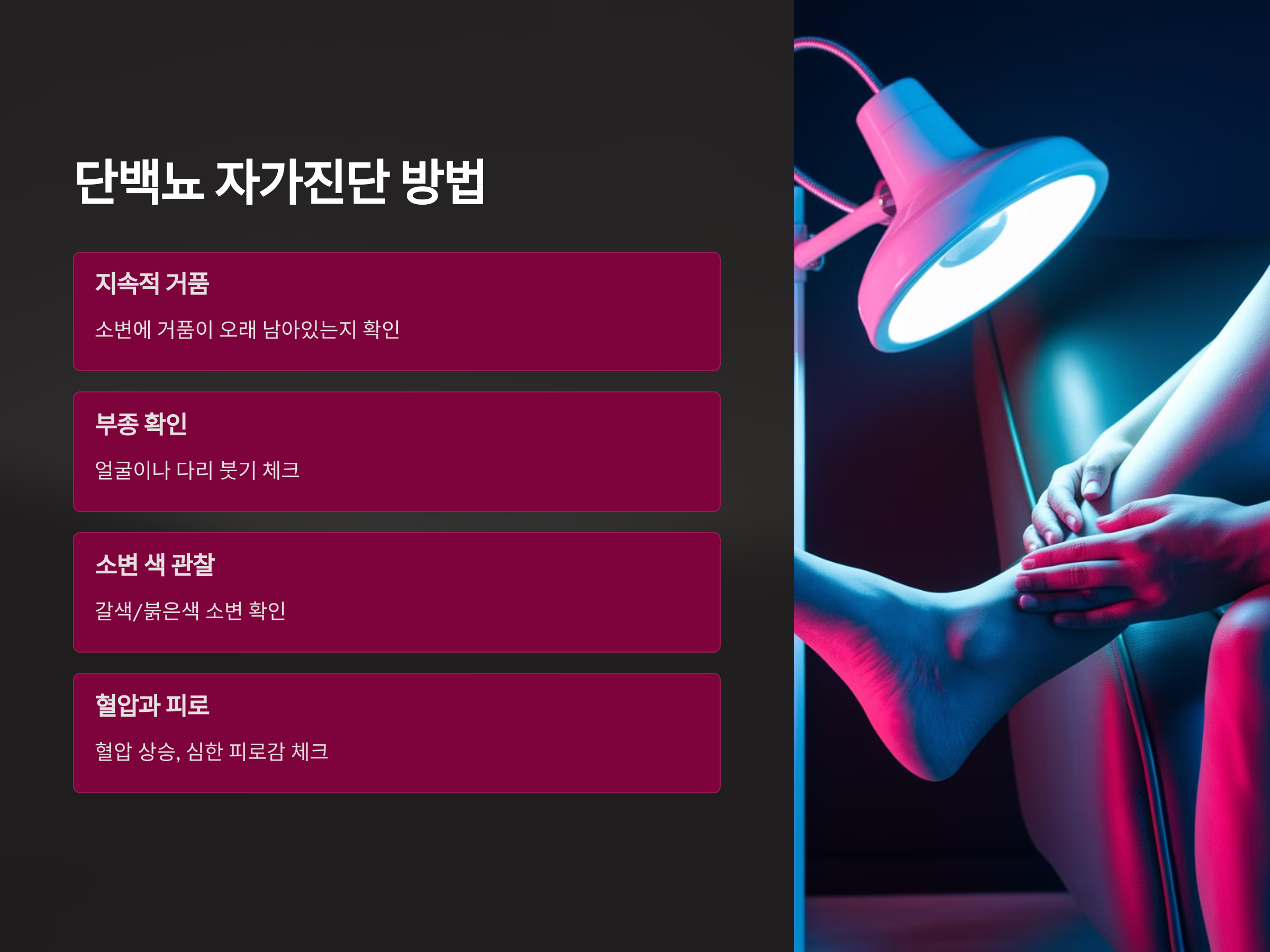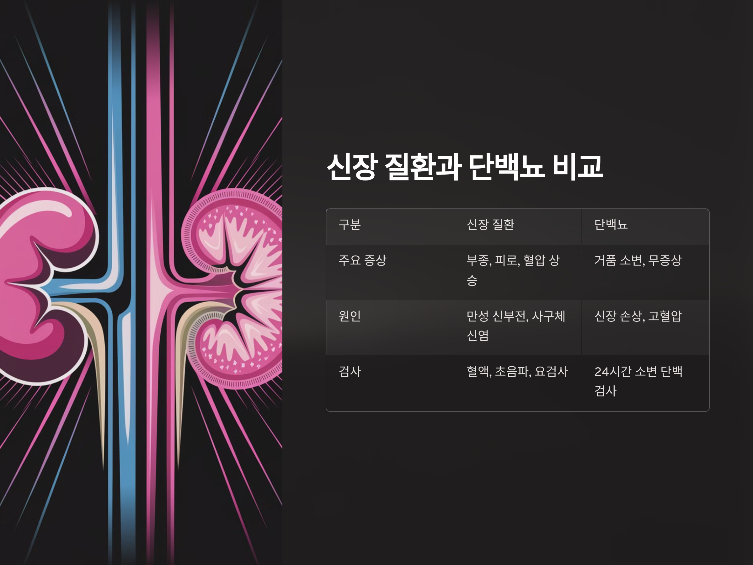 | 주요 증상 | 부종, 피로, 혈압 상승, 혈뇨 | 거품 많은 소변, 무증상인 경우 많음 |