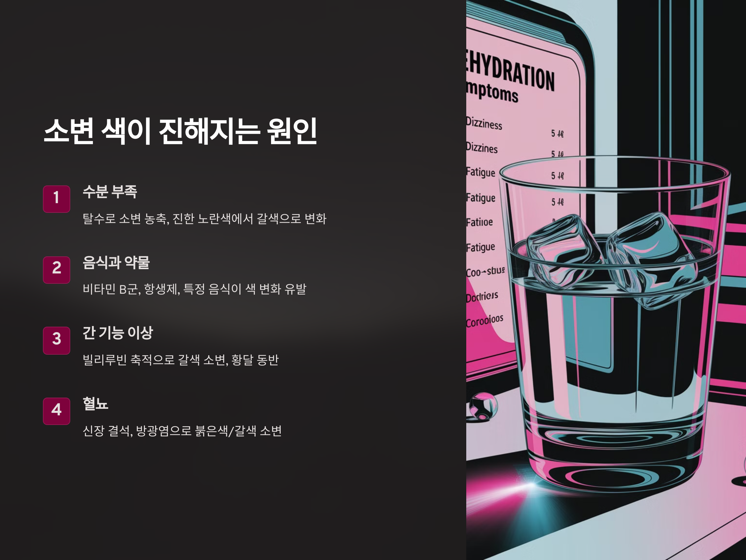 소변 색은 건강 상태를 반영하는 중요한 지표 중 하나입니다. 정상적인 소변 색은 연한 노란색에서 투명한 색을 띠지만, 점점 진해지는 경우 다양한 원인이 있을 수 있습니다.