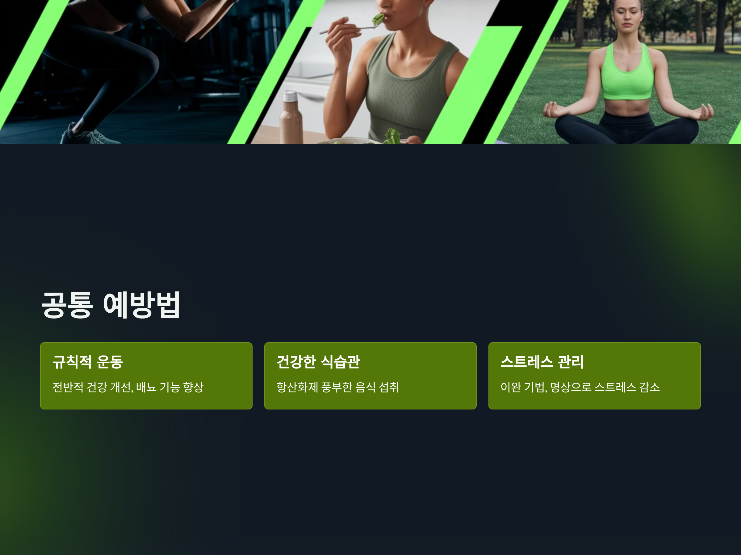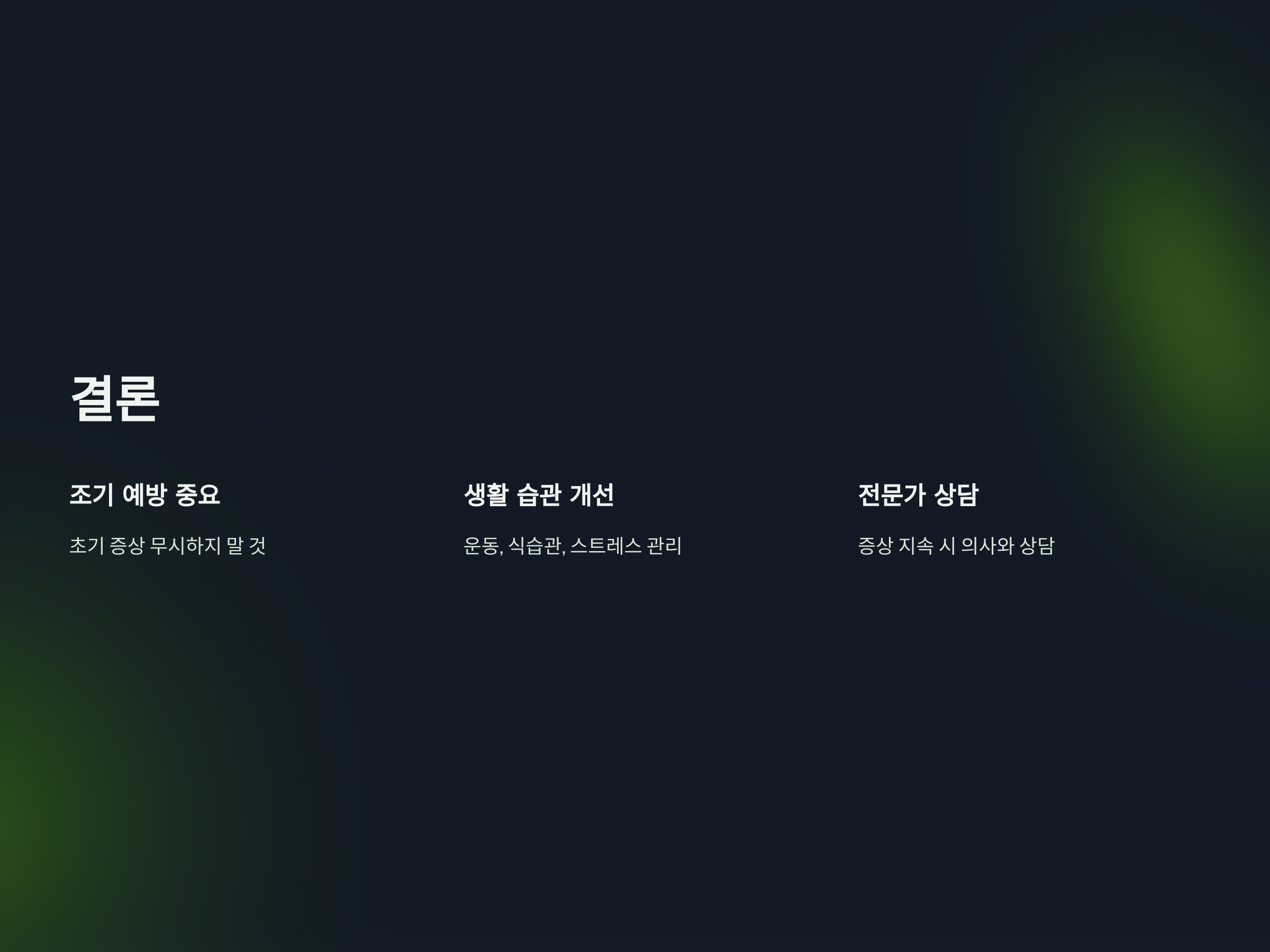 - 건강한 식습관: 항산화제가 풍부한 과일, 채소 등을 섭취하고, 지방이 많은 음식은 피하는 것이 좋습니다.