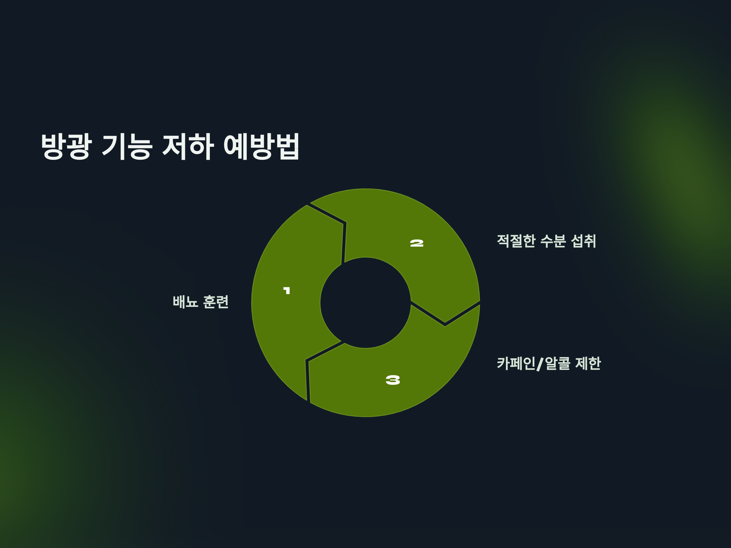 방광 기능 저하를 예방하려면, 방광을 건강하게 유지하는 것이 중요합니다. 아래의 방법들이 도움이 될 수 있습니다: