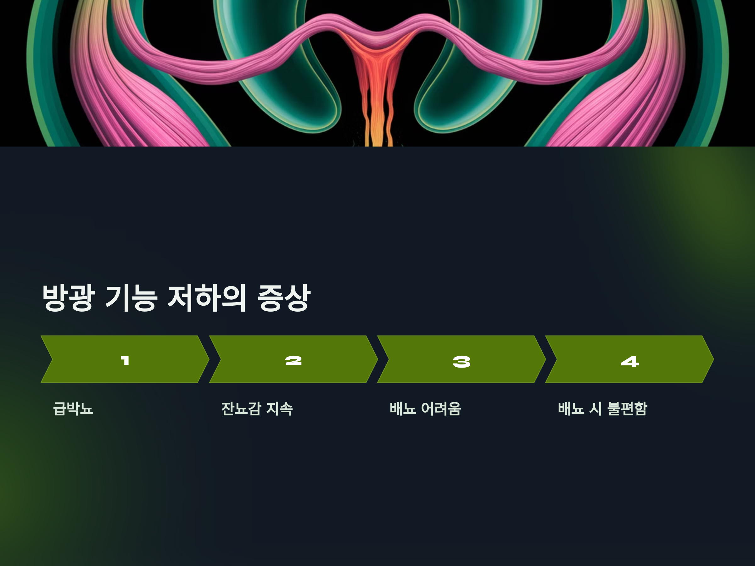 방광 기능 저하는 방광의 수축 능력이 떨어지면서 발생하는 증상입니다. 방광은 소변을 저장하고 배출하는 중요한 역할을 하는 기관인데, 방광 기능이 저하되면 소변을 제대로 배출하기 어려워지고, 잔뇨감이 지속될 수 있습니다.