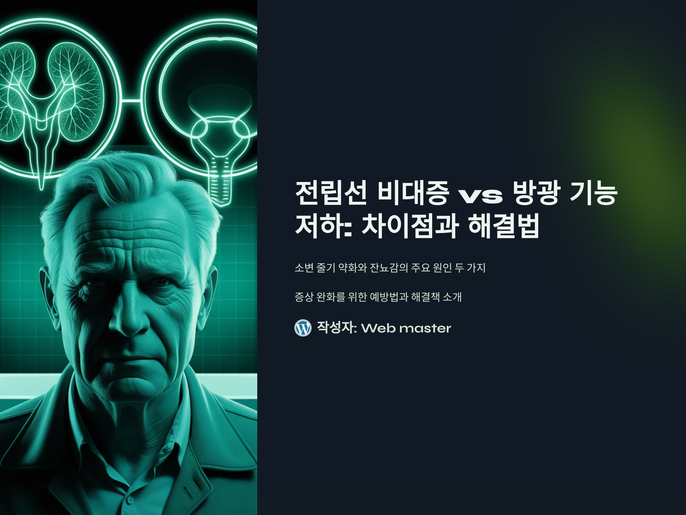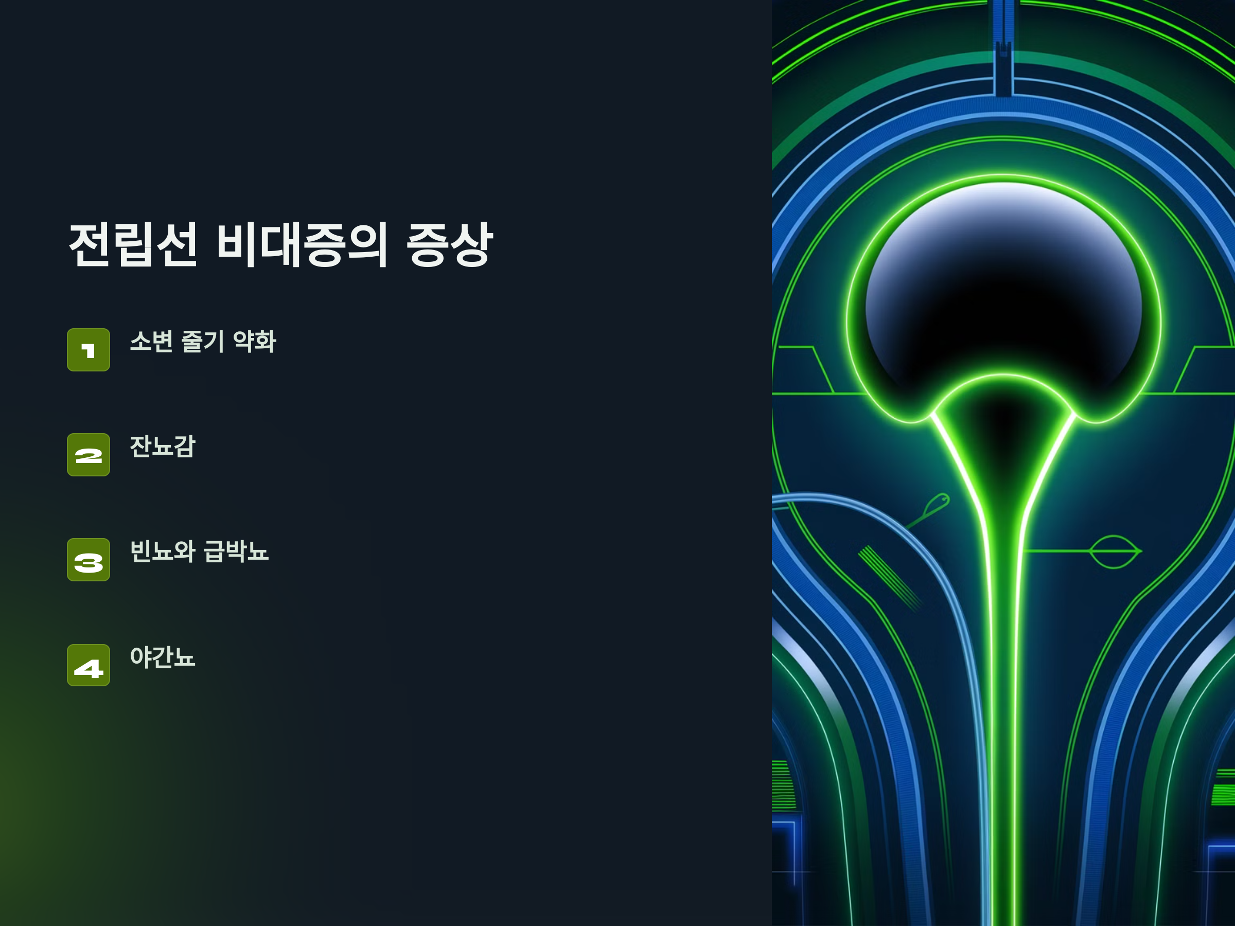 전립선 비대증은 남성에게 흔히 발생하는 질환으로, 나이가 들면서 전립선이 커져서 요도를 압박하게 됩니다. 이로 인해 소변을 보기 힘들거나, 소변 줄기가 약해지거나, 잔뇨감이 심해질 수 있습니다. 전립선 비대증의 증상은 크게 두 가지로 나눌 수 있습니다: 배뇨의 어려움과 배뇨 후 잔뇨감.