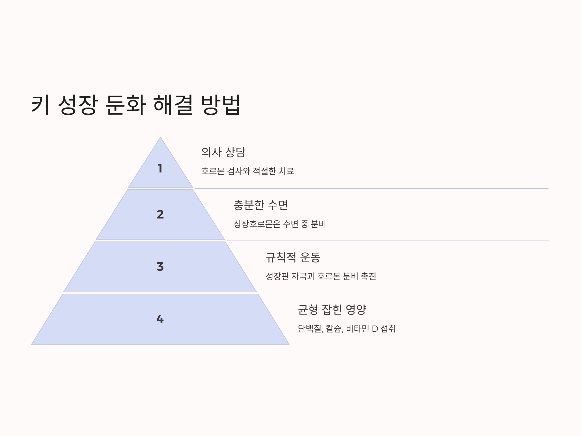 소아의 성장 지연과 키 성장 둔화는 다양한 원인에 의해 발생할 수 있습니다. 이를 해결하려면 균형 잡힌 영양 섭취, 규칙적인 운동, 충분한 수면, 의사의 상담 등이 중요합니다. 또한, 식욕 저하 문제도 해결하려면 자극적인 음식 제공과 규칙적인 식사 시간, 긍정적인 식사 환경이 필요합니다. 부모는 자녀가 건강하게 성장할 수 있도록 지속적으로 지원하고 격려해야 합니다.