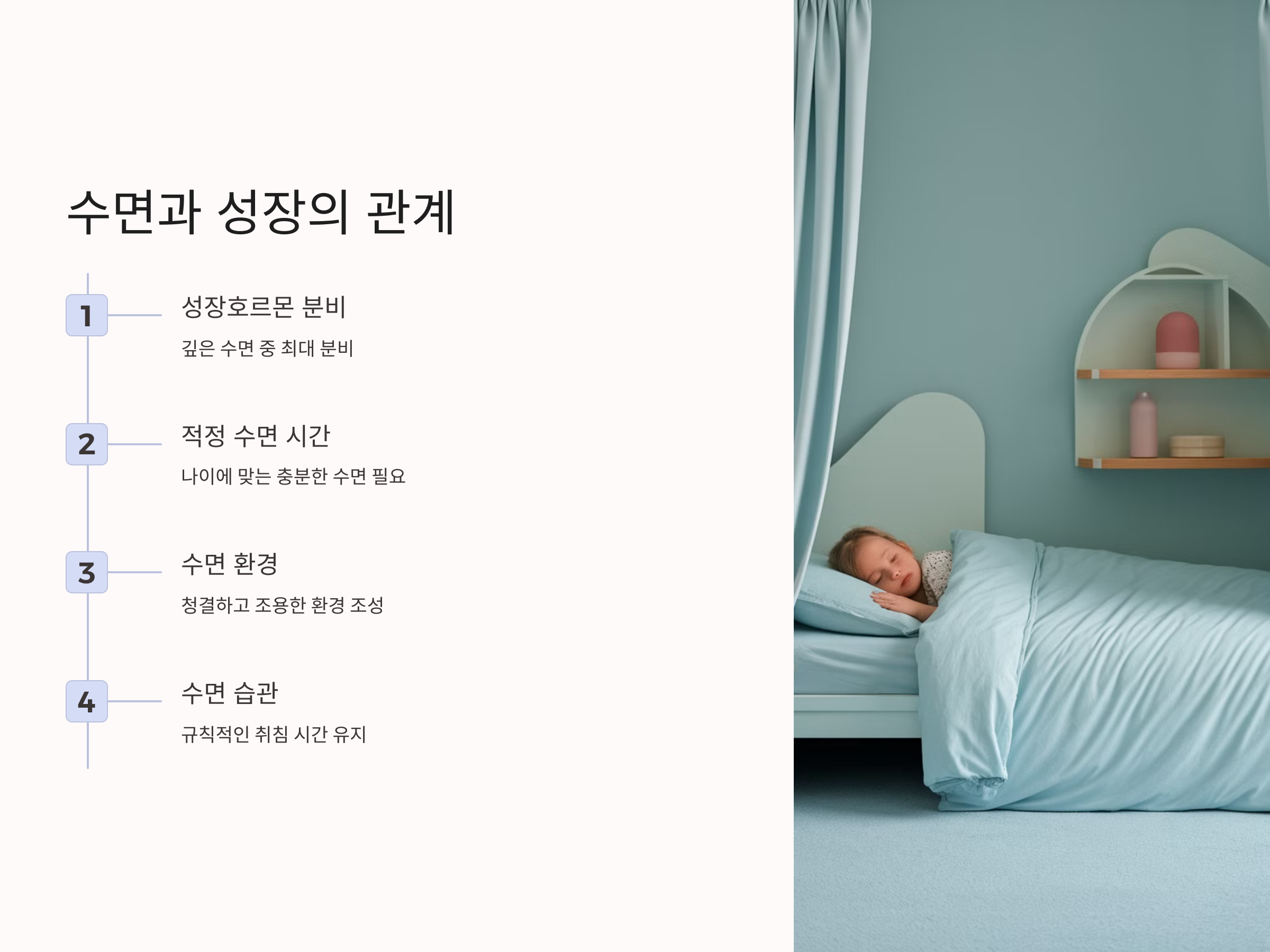 성장호르몬은 주로 수면 중에 분비됩니다. 따라서 소아가 충분한 수면을 취하는 것은 키 성장에 매우 중요합니다. 나이에 맞는 적정 수면 시간을 확보할 수 있도록 부모가 신경 써야 합니다. 또한, 수면 환경을 청결하고 조용하게 유지하여, 좋은 수면을 유도할 수 있도록 해야 합니다.