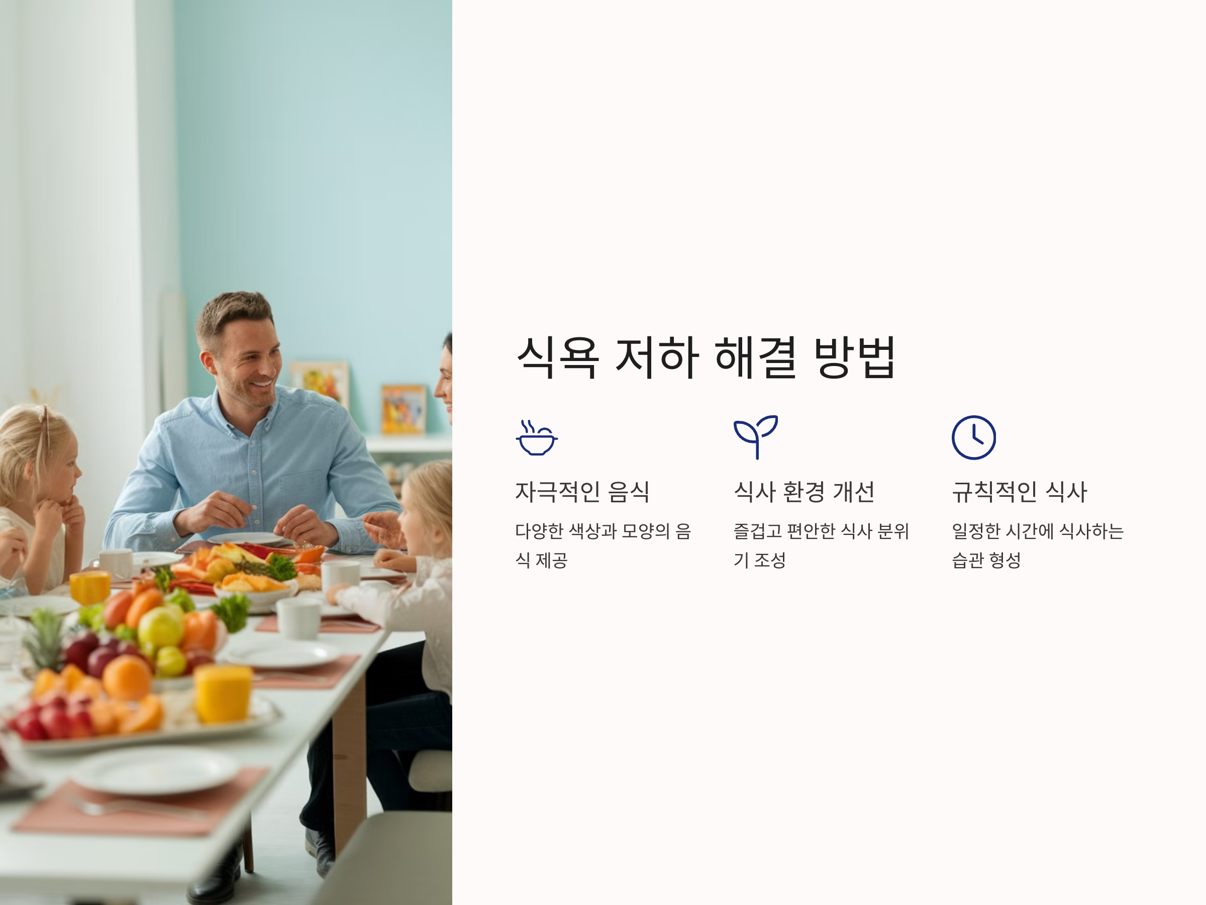 식사 환경이 불편하거나 지루하면 식욕이 떨어질 수 있습니다. 식사를 즐겁고 편안한 분위기에서 할 수 있도록 도와주는 것이 중요합니다. 함께 식사를 하거나, 가족과 대화를 나누며 긍정적인 식사 시간을 만들어 보세요.