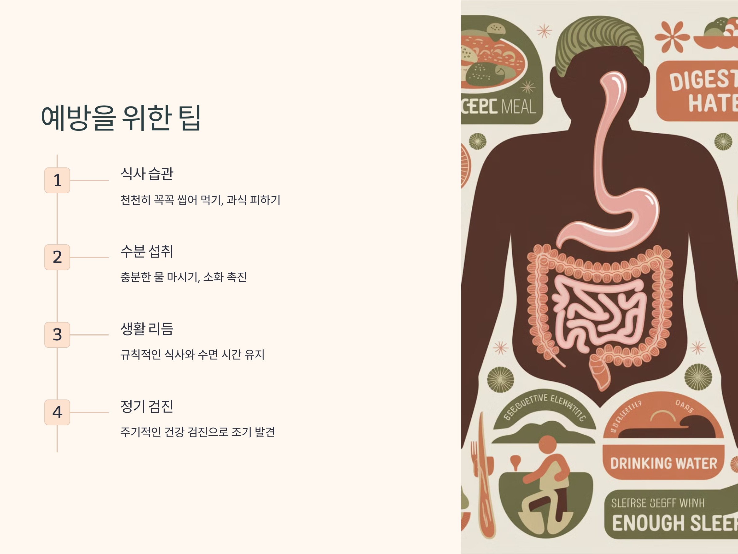 - 균형 잡힌 식단: 다양한 영양소를 골고루 섭취하여 소화기관의 부담을 줄입니다.