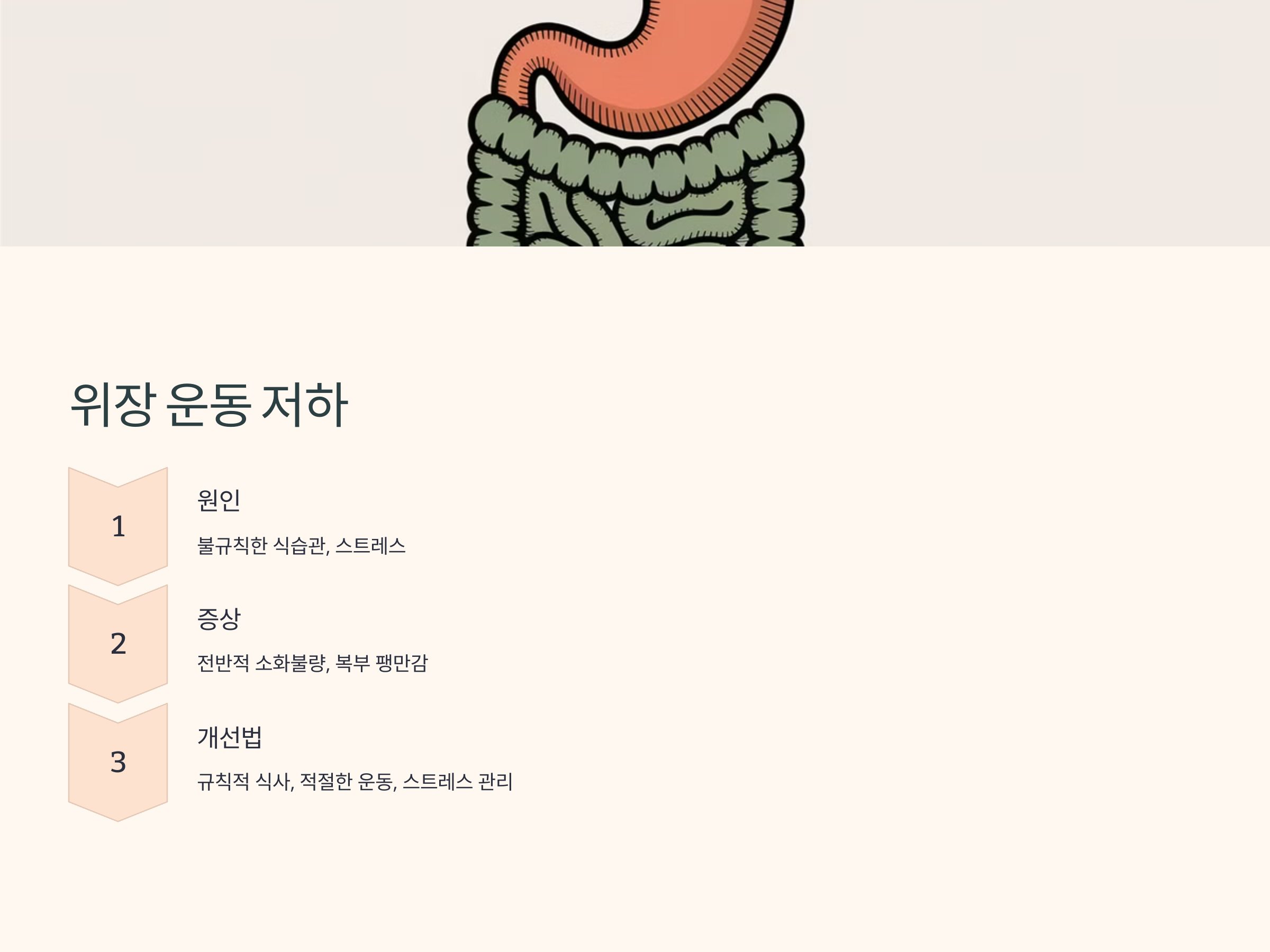 - 불규칙한 식습관: 과식이나 불규칙한 식사는 위장 운동을 저하시킬 수 있습니다.