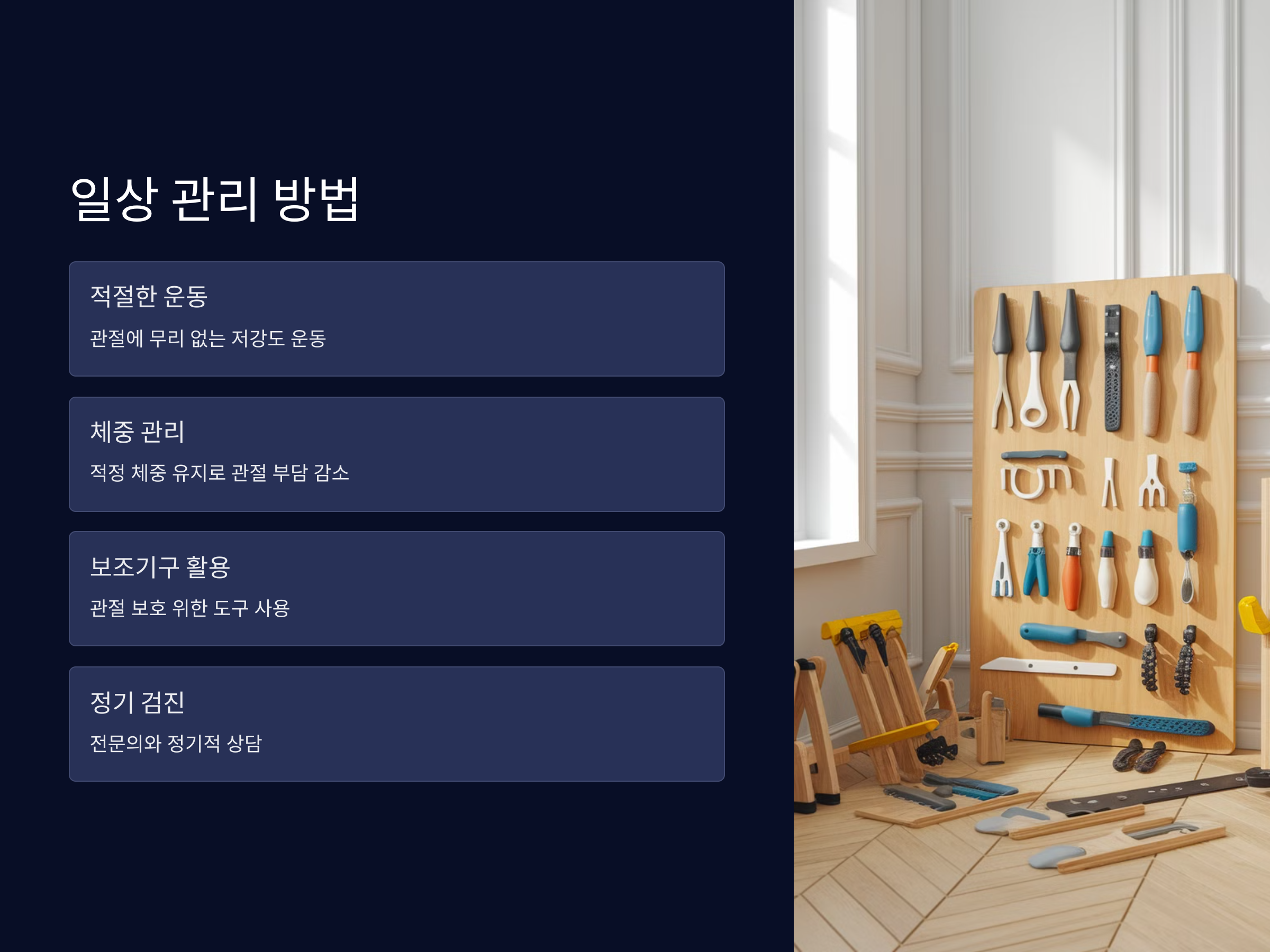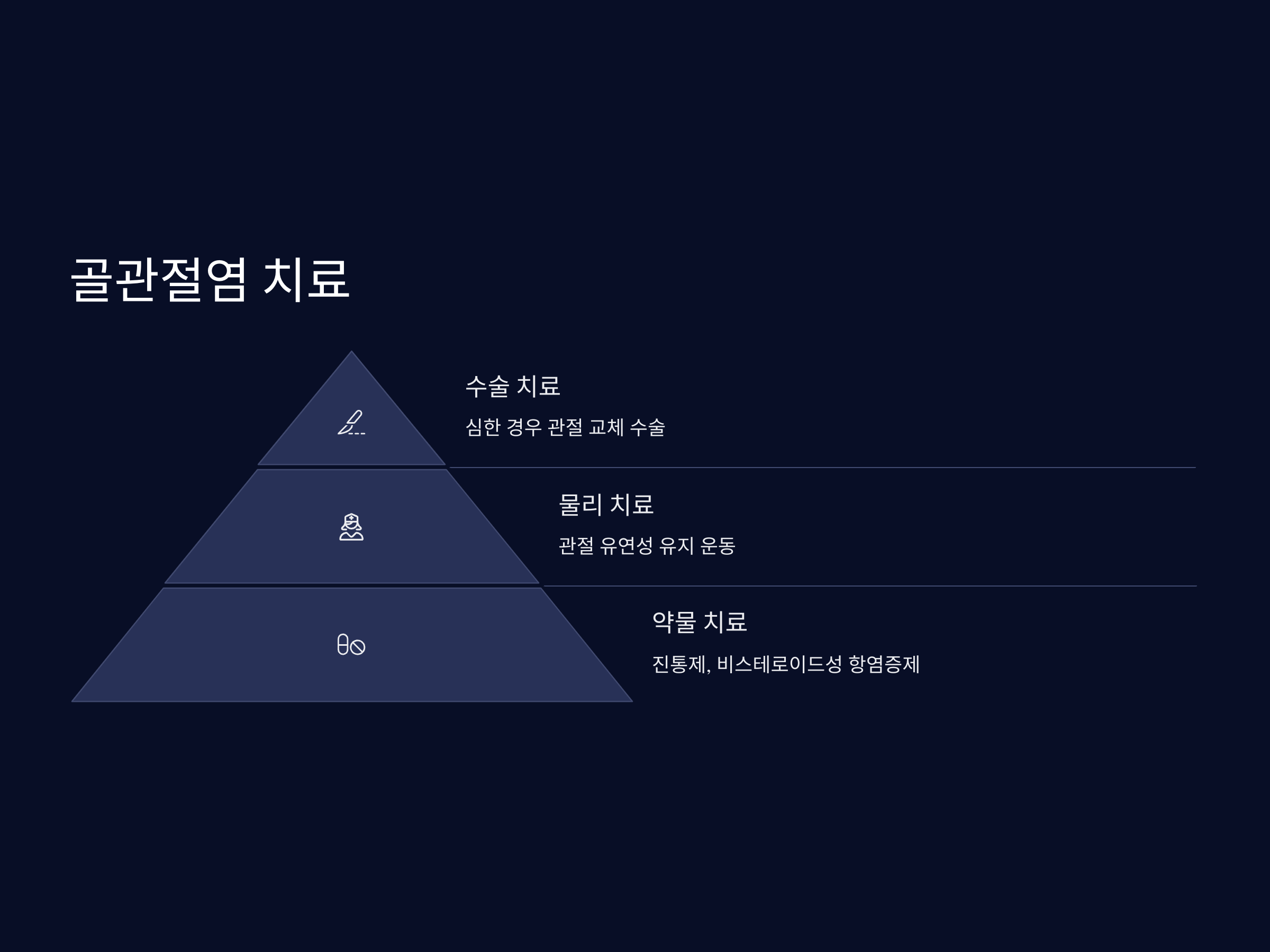 심한 경우에는 관절 교체 수술이 고려될 수 있으며, 이 경우 인공 관절을 삽입하여 손상된 관절을 대체합니다. 골관절염의 예방을 위해서는 체중 관리와 꾸준한 운동이 필요하며, 관절에 무리가 가지 않도록 주의해야 합니다.