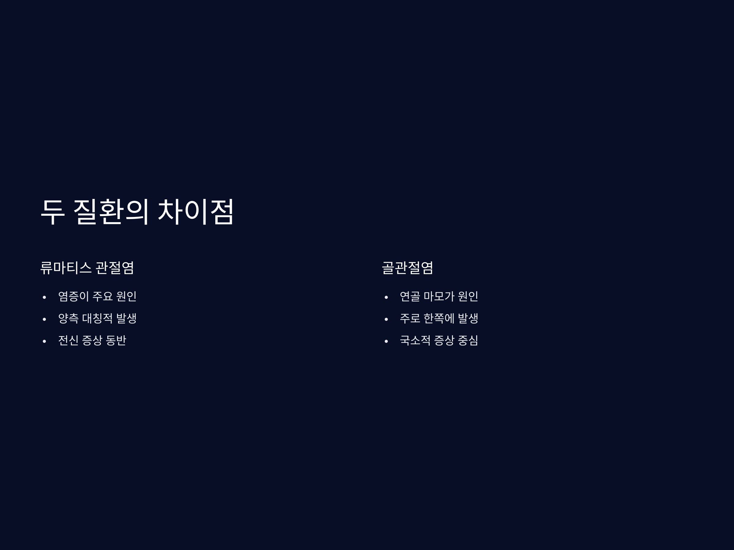 류마티스 관절염은 전신적인 염증 반응을 유발할 수 있기 때문에 피로감이나 발열, 체중 감소 등의 증상도 동반될 수 있습니다. 골관절염은 주로 관절의 마모로 인한 문제이기 때문에 다른 신체 부위에 비해 국소적인 증상에 집중되는 경향이 있습니다.