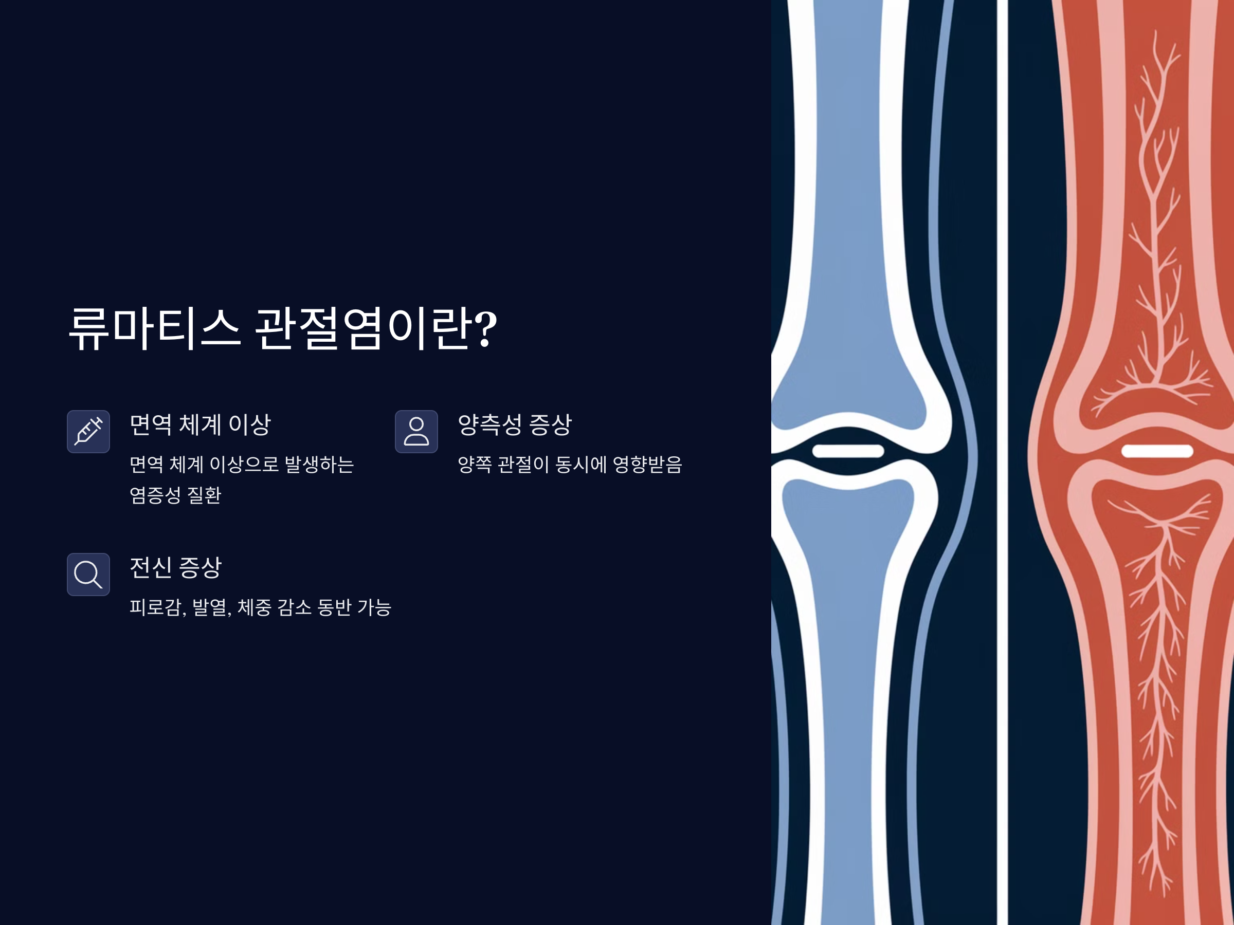 류마티스 관절염의 가장 큰 특징은 염증이 활발하게 일어나면서, 관절에 통증과 부종이 동반된다는 점입니다. 염증이 지속되면 연골이 손상되거나 관절이 변형되기 때문에, 조기 진단과 치료가 중요합니다. 또한 류마티스 관절염은 전신적인 증상을 동반할 수 있어 피로감, 발열, 체중 감소 등의 증상이 동반될 수 있습니다.
