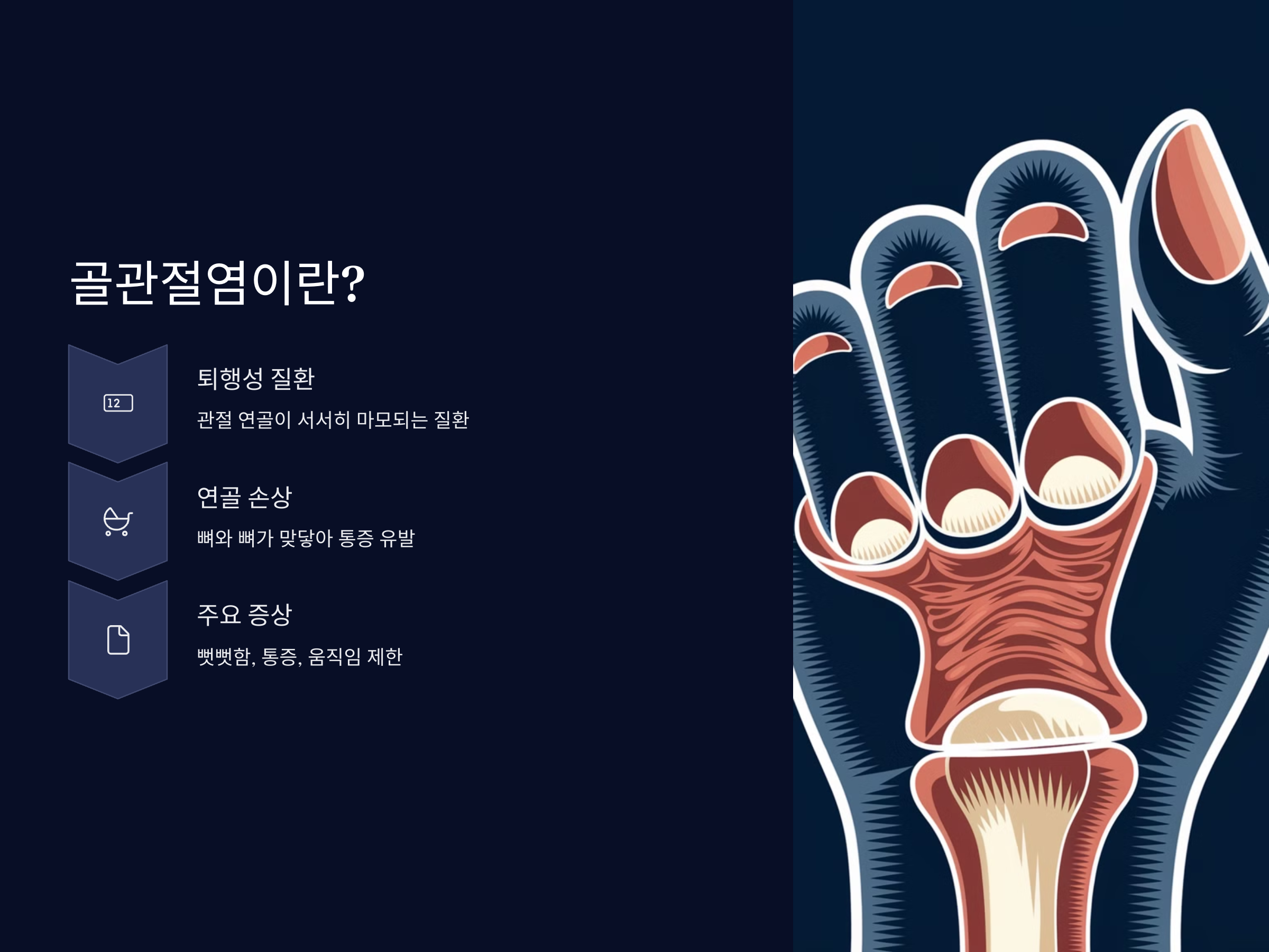 골관절염의 주요 증상은 뻣뻣함, 통증, 관절의 움직임 제한입니다. 특히 아침에 일어난 직후에 손가락이 뻣뻣해지며, 움직이기 시작하면 증상이 점차 완화되는 특징이 있습니다. 골관절염은 류마티스 관절염과 달리 염증이 두드러지지 않으며, 주로 연골이 닳아가는 것이 주요 원인입니다.