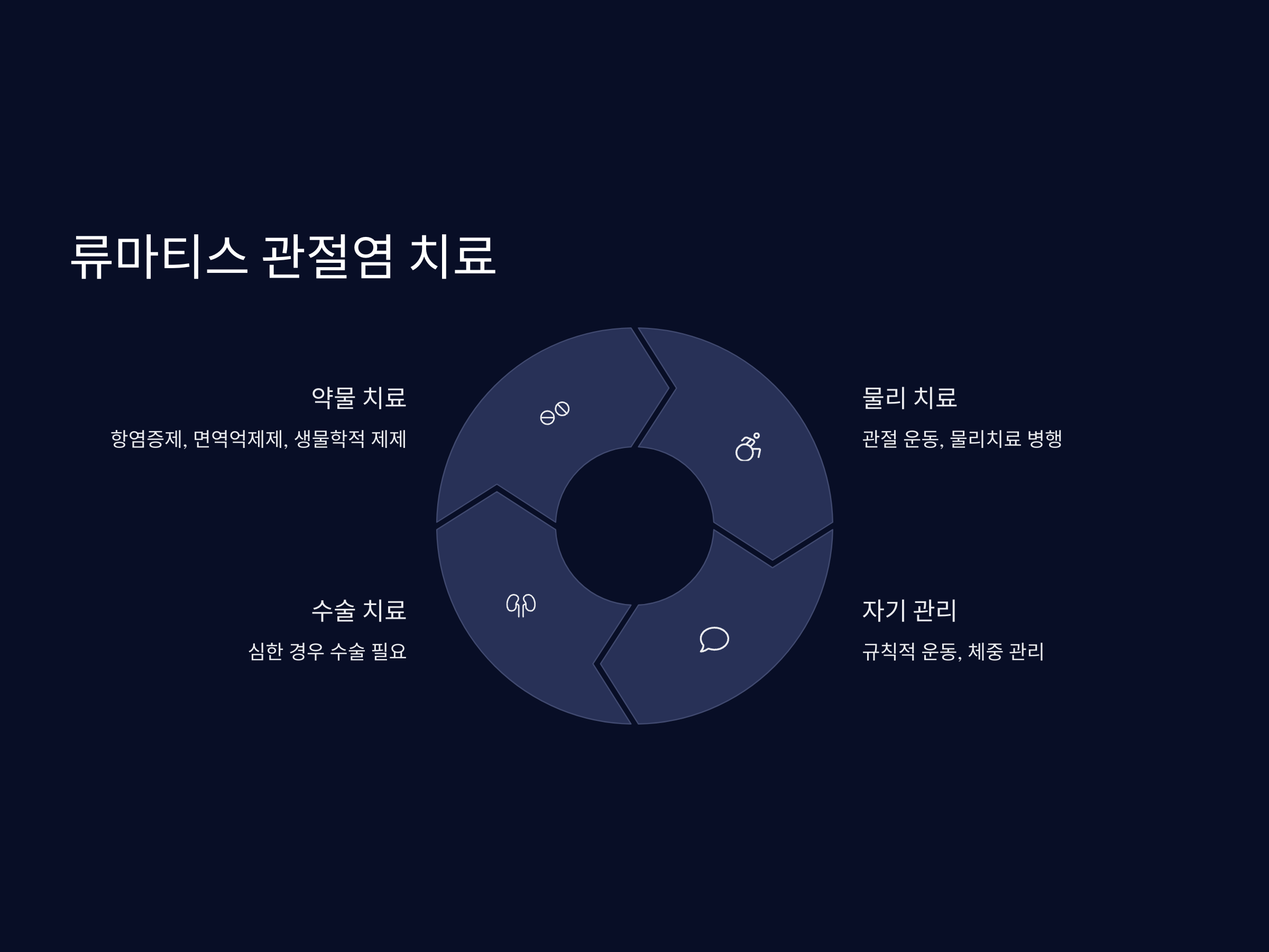 류마티스 관절염의 치료는 염증을 억제하는 데 초점을 맞춥니다. 이를 위해 항염증제, 면역억제제, 생물학적 제제 등을 사용하며, 치료는 일반적으로 약물치료와 함께 물리치료, 관절 운동 등의 보조적인 방법이 병행됩니다. 류마티스 관절염이 심한 경우, 수술이 필요할 수도 있습니다.